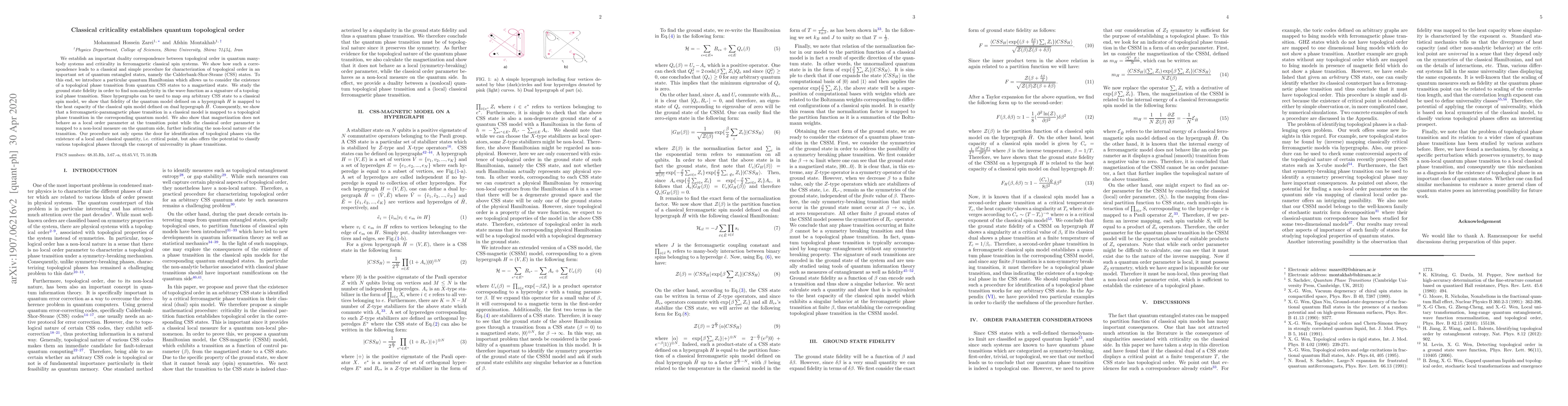 We establish an important duality correspondence between topological order in quantum many body systems and criticality in ferromagnetic classical spin systems. We show how such a correspondence leads to a classical and simple procedure for characterization of topological order in an important set of quantum entangled states, namely the Calderbank-Shor-Steane (CSS) states. To this end, we introduce a particular quantum Hamiltonian which allows us to consider the existence of a topological phase transition from quantum CSS states to a magnetized state. We study the ground state fidelity in order to find non-analyticity in the wave function as a signature of a topological phase transition. Since hypergraphs can be used to map any arbitrary CSS state to a classical spin model, we show that fidelity of the quantum model defined on a hypergraph $H$ is mapped to the heat capacity of the classical spin model defined on dual hypergraph $\tilde{H}$. Consequently, we show that a ferromagnetic-paramagnetic phase transition in a classical model is mapped to a topological phase transition in the corresponding quantum model. We also show that magnetization does not behave as a local order parameter at the transition point while the classical order parameter is mapped to a non-local measure on the quantum side, further indicating the non local nature of the transition. Our procedure not only opens the door for identification of topological phases via the existence of a local and classical quantity, i.e. critical point, but also offers the potential to classify various topological phases through the concept of universality in phase transitions.