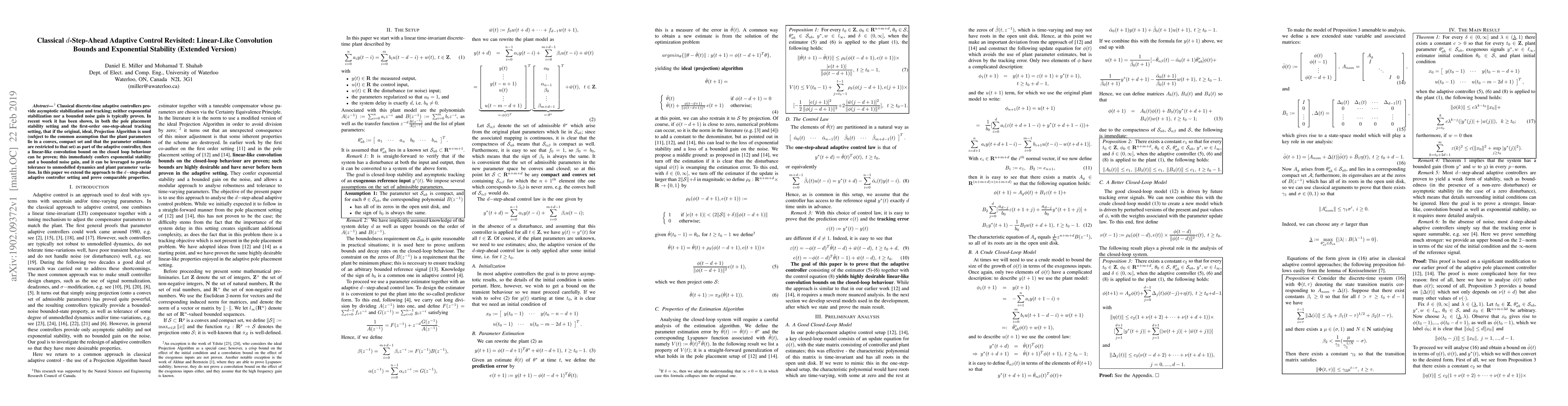 This paper extends the analysis of classical adaptive control to d-step-ahead scenarios, proving exponential stability and bounded noise gain using a linear-like convolution bound. The original Projection Algorithm, under certain assumptions, ensures these properties and provides robustness against unmodelled dynamics.