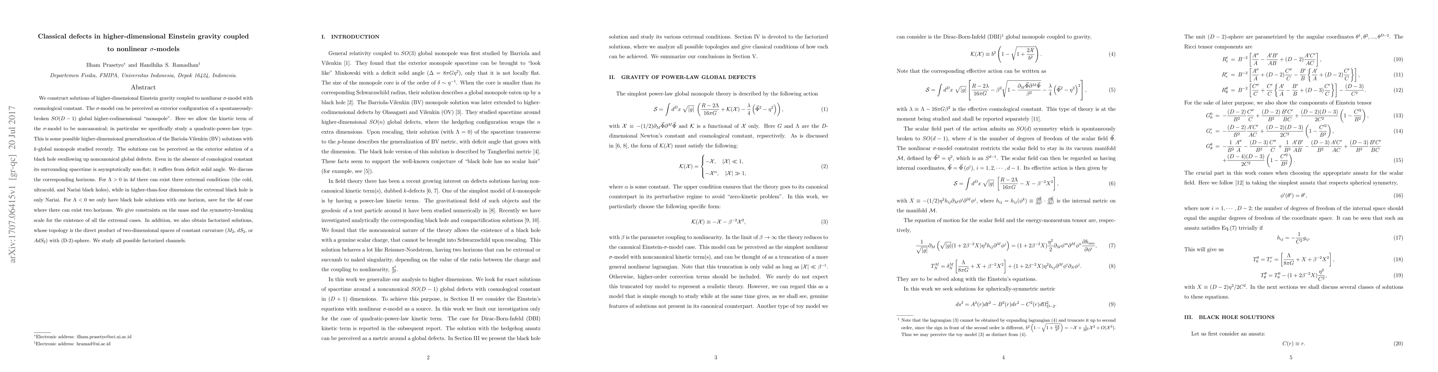 We construct solutions of higher-dimensional Einstein gravity coupled to nonlinear $\sigma$-model with cosmological constant. The $\sigma$-model can be perceived as exterior configuration of a spontaneously-broken $SO(D-1)$ global higher-codimensional "monopole". Here we allow the kinetic term of the $\sigma$-model to be noncanonical; in particular we specifically study a quadratic-power-law type. This is some possible higher-dimensional generalization of the Bariola-Vilenkin (BV) solutions with $k$-global monopole studied recently. The solutions can be perceived as the exterior solution of a black hole swallowing up noncanonical global defects. Even in the absence of comological constant its surrounding spacetime is asymptotically non-flat; it suffers from deficit solid angle. We discuss the corresponding horizons. For $\Lambda>0$ in $4d$ there can exist three extremal conditions (the cold, ultracold, and Nariai black holes), while in higher-than-four dimensions the extremal black hole is only Nariai. For $\Lambda<0$ we only have black hole solutions with one horizon, save for the $4d$ case where there can exist two horizons. We give constraints on the mass and the symmetry-breaking scale for the existence of all the extremal cases. In addition, we also obtain factorized solutions, whose topology is the direct product of two-dimensional spaces of constant curvature ($M_2$, $dS_2$, or $AdS_2$) with (D-2)-sphere. We study all possible factorized channels.
