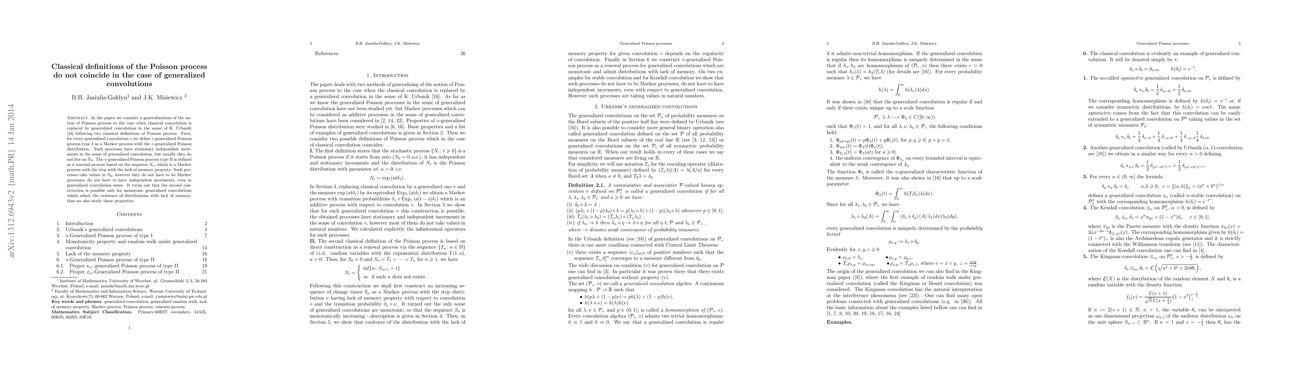 In the paper we consider a generalizations of the notion of Poisson process to the case when classical convolution is replaced by generalized convolution in the sense of K. Urbanik [16] following two classical definitions of Poisson process. First, for every generalized convolution $\diamond$ we define $\diamond$-generalized Poisson process type I as a Markov process with the $\diamond$-generalized Poisson distribution. Such processes have stationary independent increments in the sense of generalized convolution, but usually they do not live on $\mathbb{N}_0$. The $\diamond$-generalized Poisson process type II is defined as a renewal process based on the sequence $S_n$, which is a Markov process with the step with the lack of memory property. Such processes take values in $\mathbb{N}_0$, however they do not have to be Markov processes, do not have to have independent increments, even in generalized convolution sense. It turns out that the second construction is possible only for monotonic generalized convolutions which admit the existence of distributions with lack of memory, thus we also study these properties.