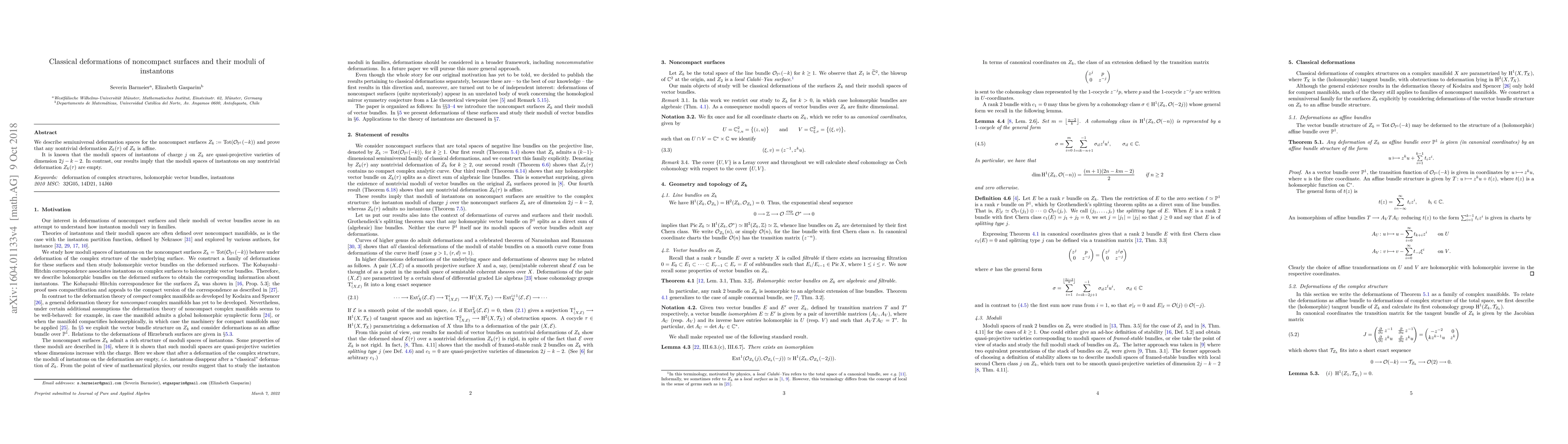 Summary: The paper explores deformations of the noncompact surfaces $Z_k$ and finds that nontrivial deformations are affine. It concludes that the moduli spaces of instantons on these nontrivial deformations are empty, contrasting with the quasi-projective dimensions of instantons on the original surfaces.