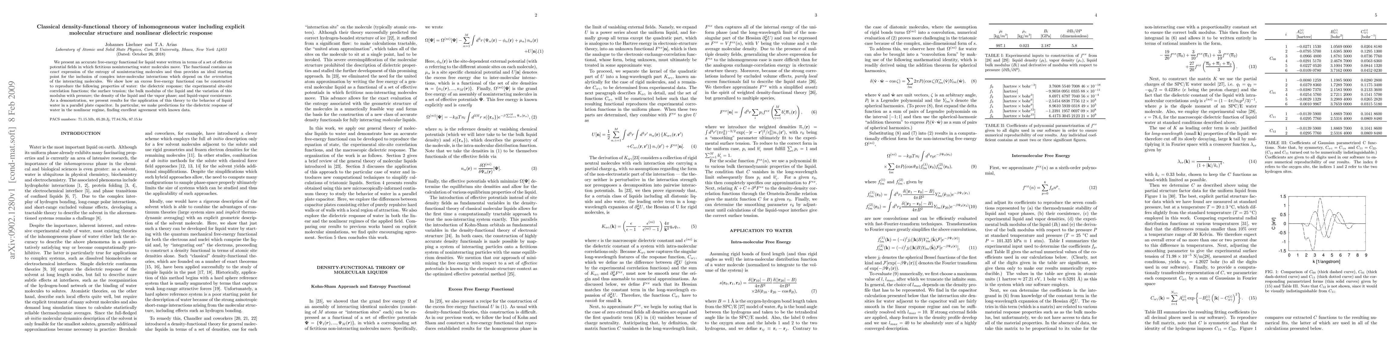 This paper develops a precise free-energy functional for inhomogeneous water, incorporating explicit molecular structure and nonlinear dielectric response. The functional accurately reproduces various properties of water and demonstrates its effectiveness in predicting the dielectric response in a parallel plate capacitor.