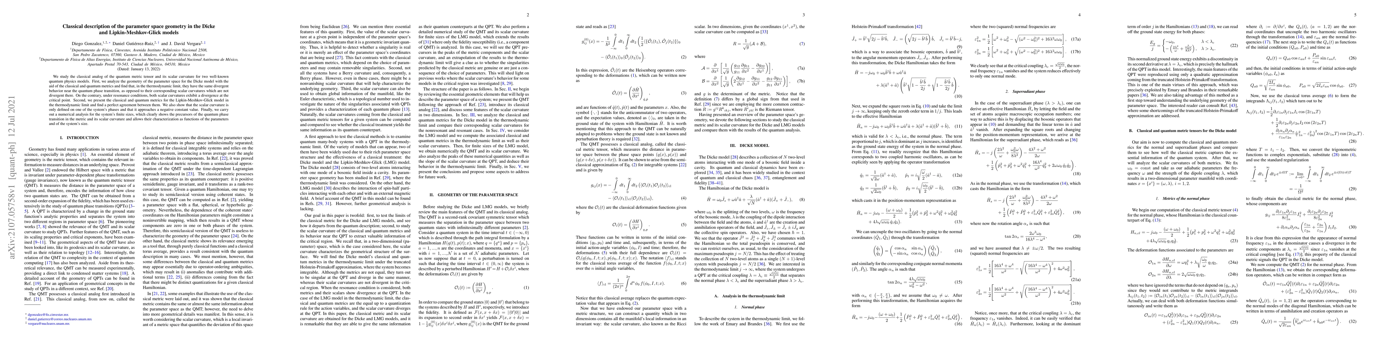 We study the classical analog of the quantum metric tensor and its scalar curvature for two well-known quantum physics models. First, we analyze the geometry of the parameter space for the Dicke model with the aid of the classical and quantum metrics and find that, in the thermodynamic limit, they have the same divergent behavior near the quantum phase transition, as opposed to their corresponding scalar curvatures which are not divergent there. On the contrary, under resonance conditions, both scalar curvatures exhibit a divergence at the critical point. Second, we present the classical and quantum metrics for the Lipkin-Meshkov-Glick model in the thermodynamic limit and find a perfect agreement between them. We also show that the scalar curvature is only defined on one of the system's phases and that it approaches a negative constant value. Finally, we carry out a numerical analysis for the system's finite sizes, which clearly shows the precursors of the quantum phase transition in the metric and its scalar curvature and allows their characterization as functions of the parameters and of the system's size.