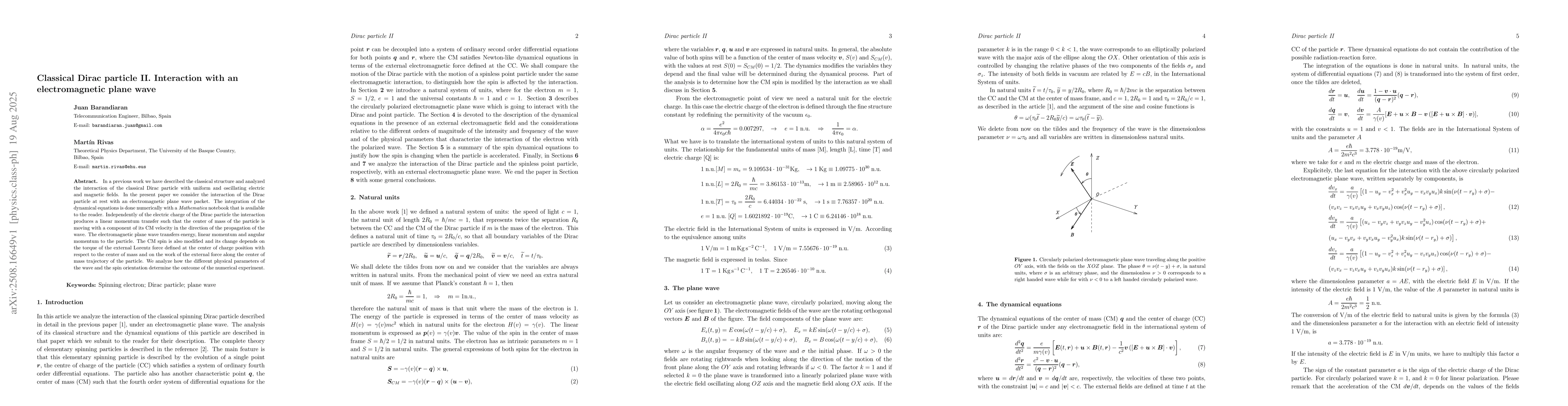 In a previous work we have described the classical structure and analyzed the interaction of the classical Dirac particle with uniform and oscillating electric and magnetic fields. In the present paper we consider the interaction of the Dirac particle at rest with an electromagnetic plane wave packet. The integration of the dynamical equations is done numerically with a Mathematica notebook that is available to the reader. Independently of the electric charge of the Dirac particle the interaction produces a linear momentum transfer such that the center of mass of the particle is moving with a component of its CM velocity in the direction of the propagation of the wave. The electromagnetic plane wave transfers energy, linear momentum and angular momentum to the particle. The CM spin is also modified and its change depends on the torque of the external Lorentz force defined at the center of charge position with respect to the center of mass and on the work of the external force along the center of mass trajectory of the particle. We analyze how the different physical parameters of the wave and the spin orientation determine the outcome of the numerical experiment.