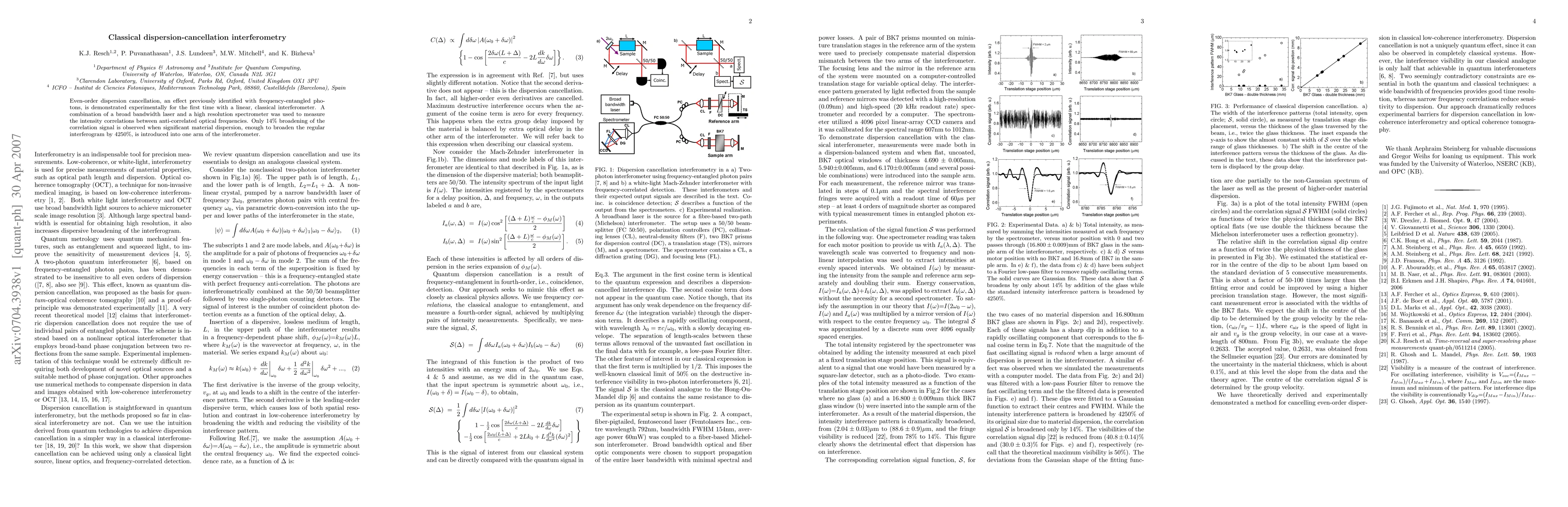 This paper demonstrates even-order dispersion cancellation in a classical interferometer for the first time, using a broad bandwidth laser and high resolution spectrometer. The experiment shows only 14% broadening of the correlation signal despite significant material dispersion that would normally cause 4250% broadening.