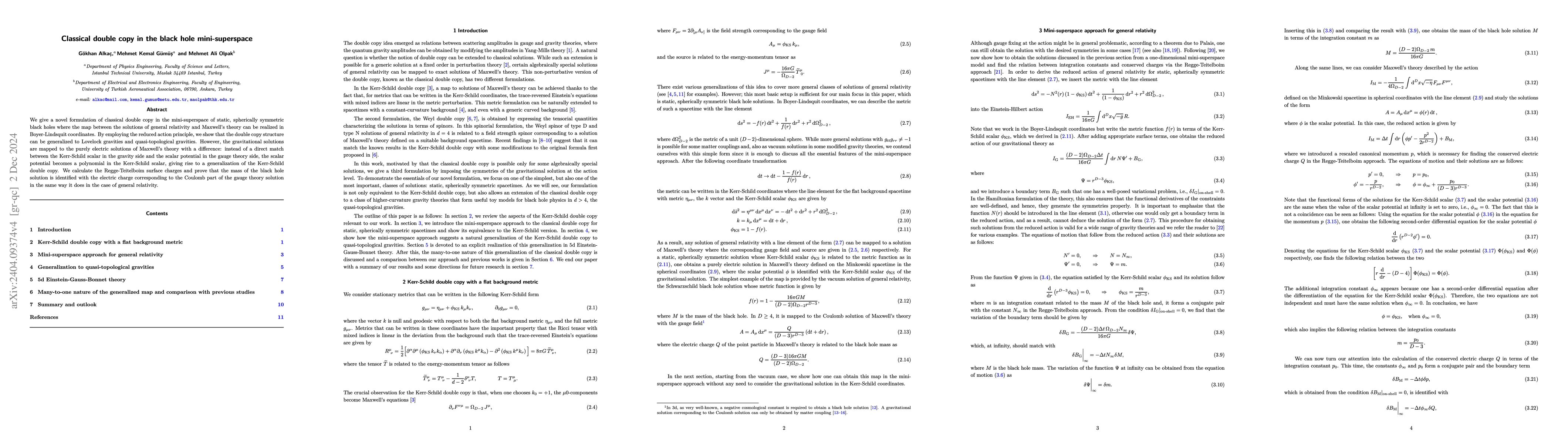 We give a novel formulation of classical double copy in the mini-superspace of static, spherically symmetric black holes where the map between the solutions of general relativity and Maxwell's theory can be realized in Boyer-Lindsquit coordinates. By employing the reduced action principle, we show that the double copy structure can be generalized to Lovelock gravities and quasi-topological gravities. However, the gravitational solutions are mapped to the purely electric solutions of Maxwell's theory with a difference: instead of a direct match between the Kerr-Schild scalar in the gravity side and the scalar potential in the gauge theory side, the scalar potential becomes a polynomial in the Kerr-Schild scalar, giving rise to a generalization of the Kerr-Schild double copy. We calculate the Regge-Teitelboim surface charges and prove that the mass of the black hole solution is identified with the electric charge corresponding to the Coulomb part of the gauge theory solution in the same way it does in the case of general relativity.