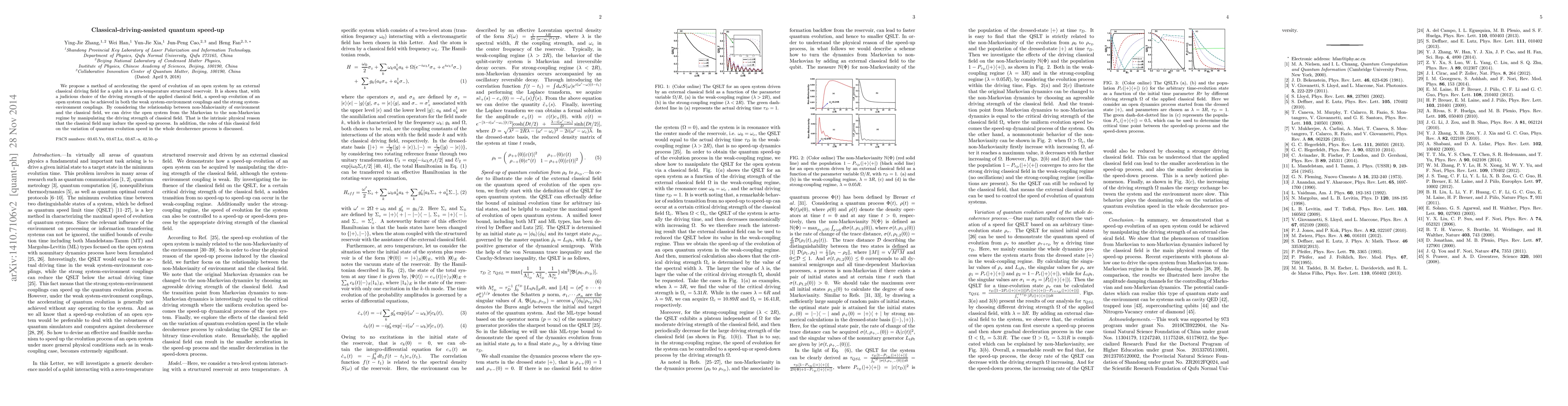 This paper proposes a method to accelerate the evolution of an open quantum system using an external classical driving field, demonstrating speed-up in both weak and strong system-environment couplings. The study explores how adjusting the driving strength can transition the system from Markovian to non-Markovian regimes, thereby inducing the speed-up process.