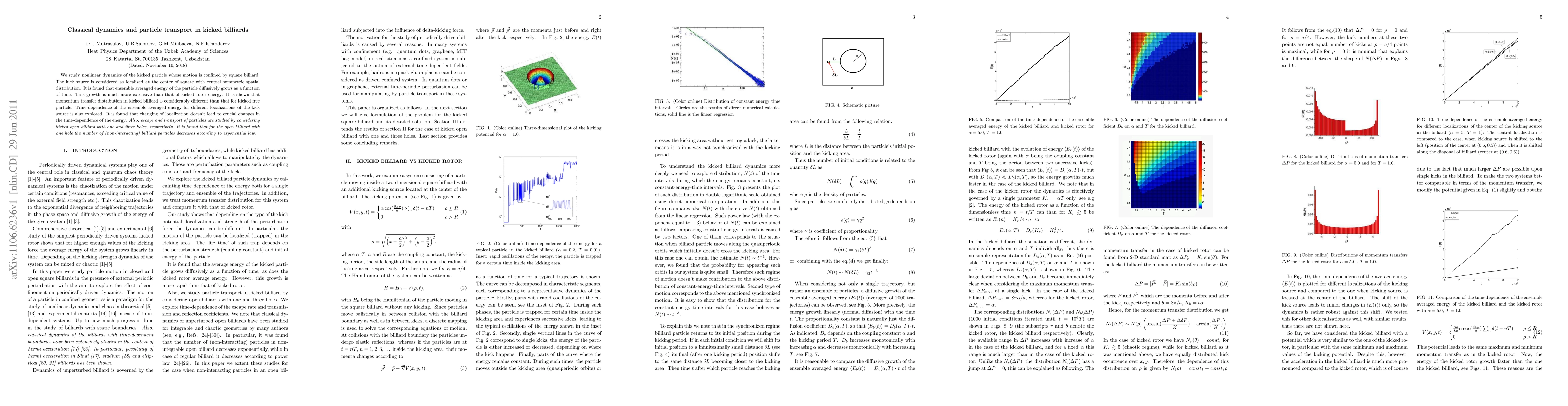 This paper investigates the nonlinear dynamics of a kicked particle in a square billiard, finding that its energy diffuses over time more extensively than in a kicked rotor. It also explores the effects of different kick source localizations and particle transport in open billiards, revealing exponential decay in particle number for a single-hole configuration.