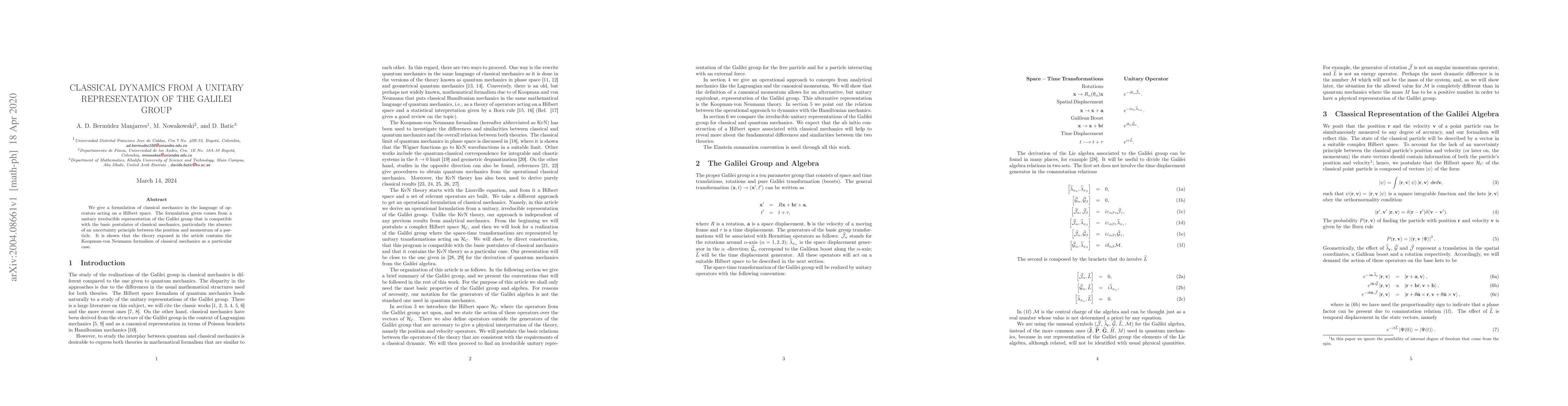 This paper formulates classical mechanics using operators on a Hilbert space derived from a unitary representation of the Galilei group, ensuring compatibility with classical mechanics' postulates, notably the absence of an uncertainty principle. It demonstrates that this approach encompasses the Koopman-von Neumann formalism as a special case.