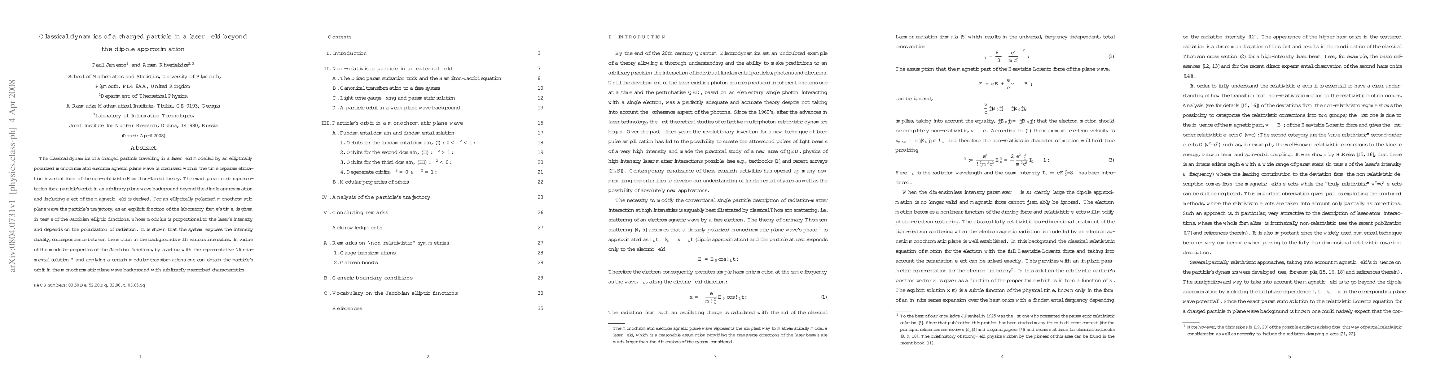 This paper derives the exact parametric representation for the classical dynamics of a charged particle in a laser field modeled by an elliptically polarized monochromatic electromagnetic plane wave, beyond the dipole approximation. The particle's trajectory is expressed using Jacobian elliptic functions, revealing an "intensity duality" and the ability to obtain orbits with prescribed characteristics through modular transformations.
