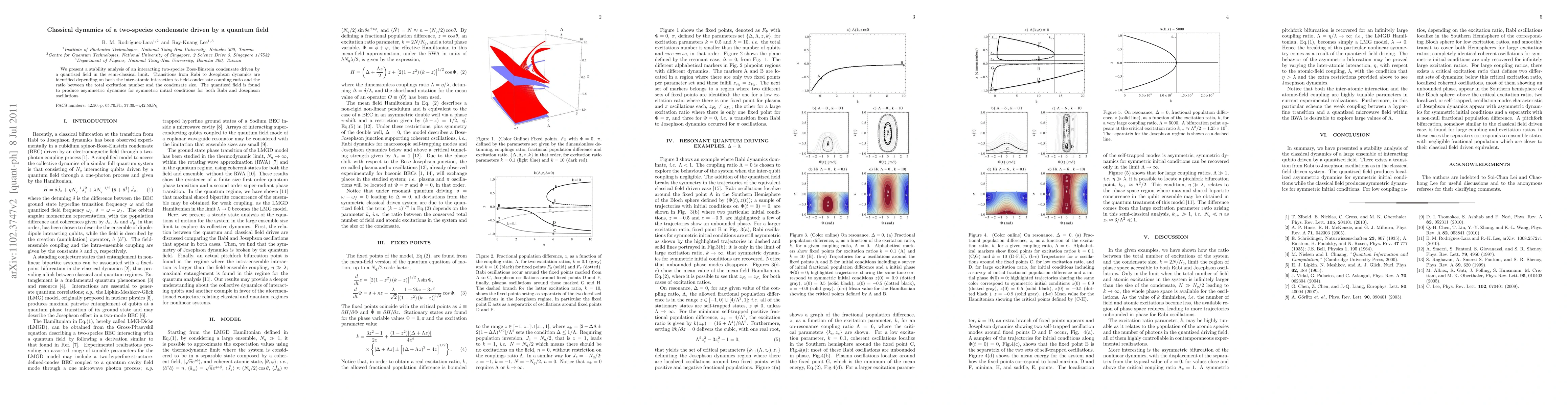 This paper analyzes the stability of a two-species Bose-Einstein condensate driven by a quantum field, identifying transitions between Rabi and Josephson dynamics based on interaction ratios and excitation numbers. The study reveals asymmetric dynamics induced by the quantized field even under symmetric initial conditions.