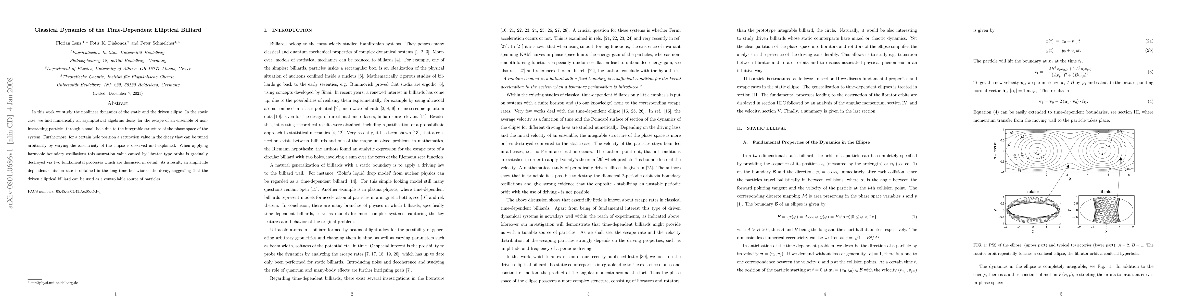 In this work we study the nonlinear dynamics of the static and the driven ellipse. In the static case, we find numerically an asymptotical algebraic decay for the escape of an ensemble of non-interacting particles through a small hole due to the integrable structure of the phase space of the system. Furthermore, for a certain hole position a saturation value in the decay that can be tuned arbitrarily by varying the eccentricity of the ellipse is observed and explained. When applying harmonic boundary oscillations this saturation value caused by librator type orbits is gradually destroyed via two fundamental processes which are discussed in detail. As a result, an amplitude dependent emission rate is obtained in the long time behavior of the decay, suggesting that the driven elliptical billiard can be used as a controllable source of particles.