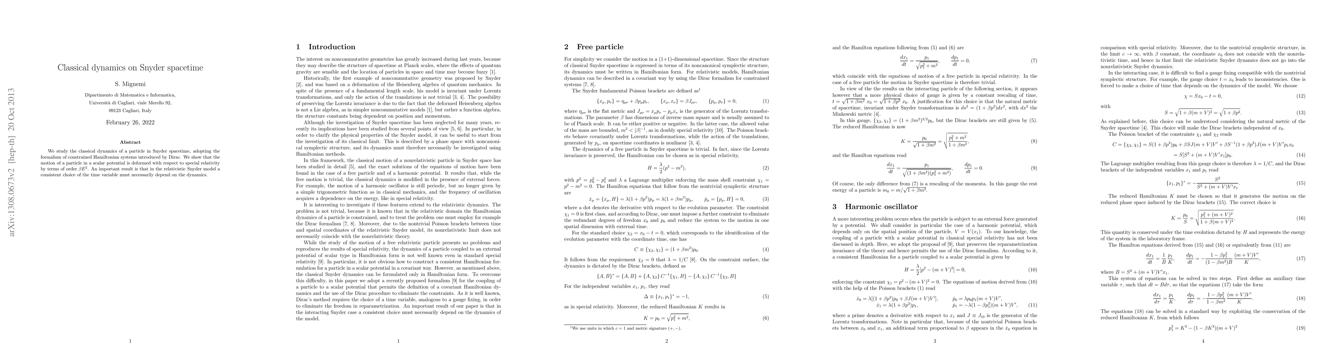 We study the classical dynamics of a particle in Snyder spacetime, adopting the formalism of constrained Hamiltonian systems introduced by Dirac. We show that the motion of a particle in a scalar potential is deformed with respect to special relativity by terms of order \beta E^2. An important result is that in the relativistic Snyder model a consistent choice of the time variable must necessarily depend on the dynamics.