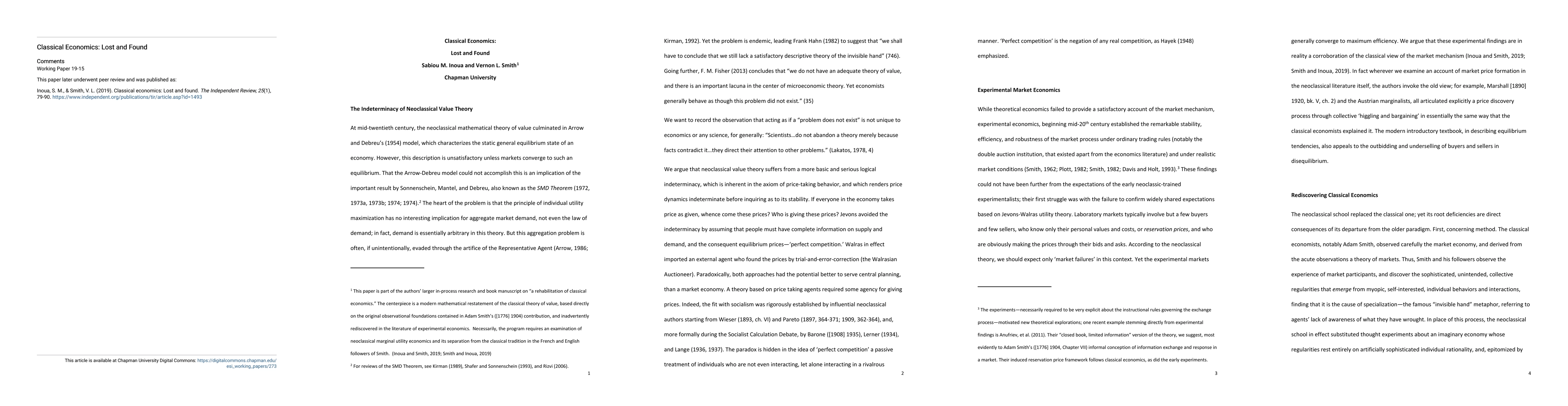 "Economists miss the boat when they act as if Arrow and Debreu's general equilibrium model accurately describes markets in the real world of constant change. In contrast, the classical view on the market mechanism offers a helpful foundation on which to add modern insights about how markets create and coordinate information."