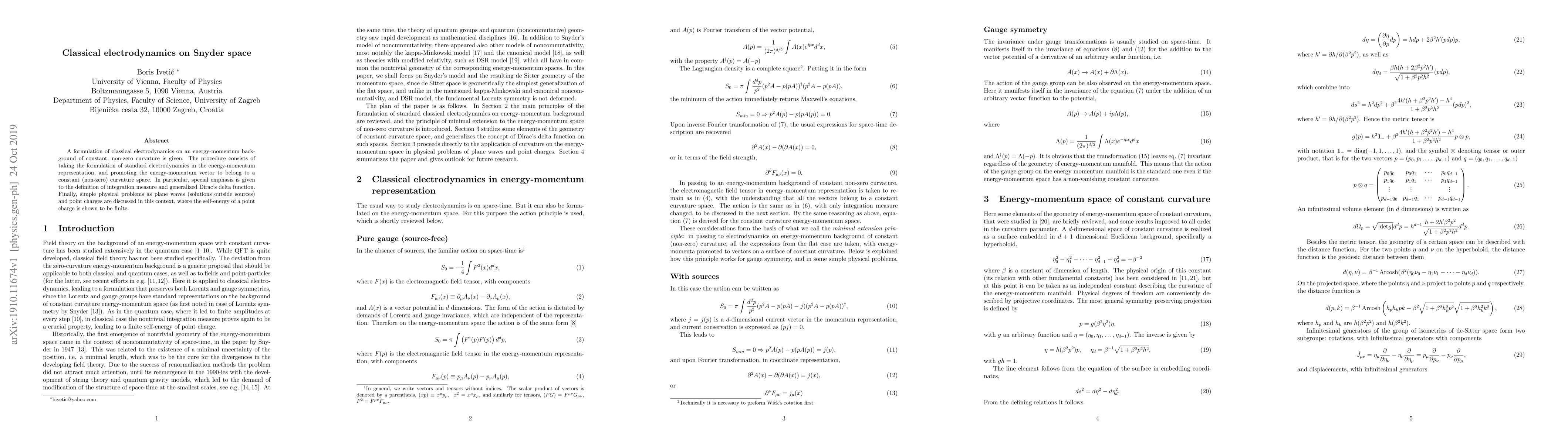 This paper formulates classical electrodynamics on Snyder space with a constant curvature background, focusing on defining an integration measure and generalized Dirac delta function. It demonstrates finite self-energy for point charges and discusses plane wave solutions in this modified framework.