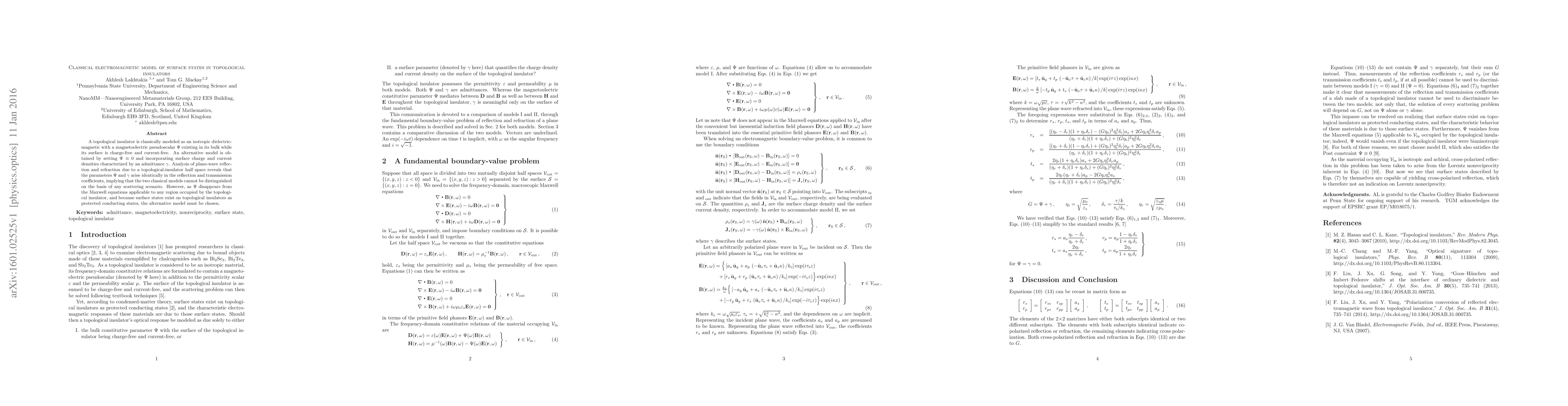This paper explores two classical models of topological insulators: one with a magnetoelectric pseudoscalar $\Psi$ and another with surface charge and current densities characterized by admittance $\gamma$. Despite identical parameters in scattering scenarios, the absence of $\Psi$ in Maxwell equations and the existence of protected surface states favor the model with $\gamma$.
