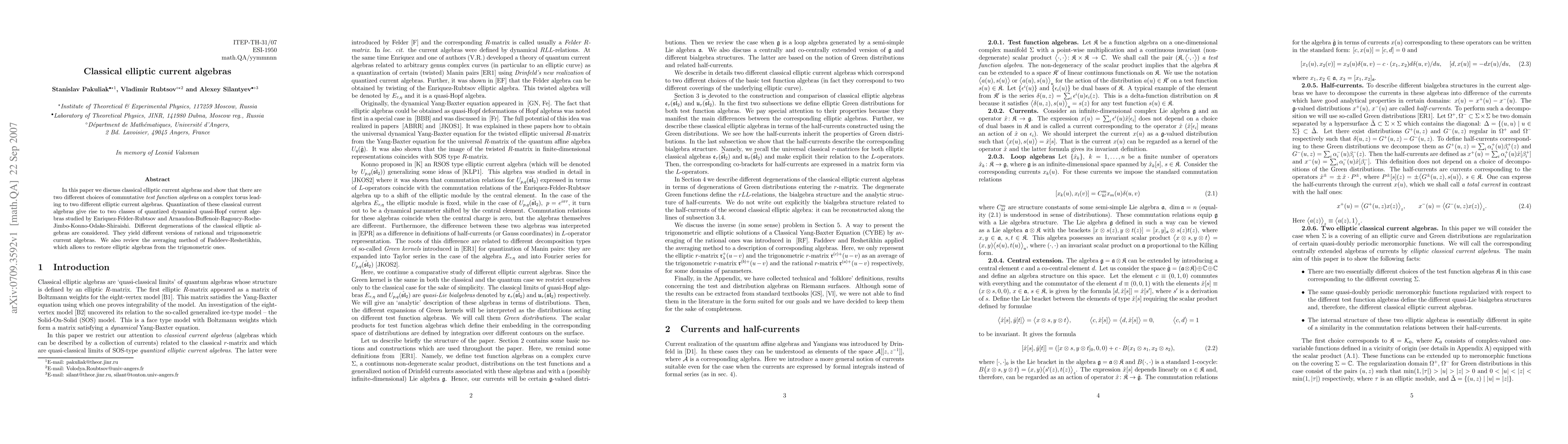 In this paper we discuss classical elliptic current algebras and show that there are two different choices of commutative test function algebras on a complex torus leading to two different elliptic current algebras. Quantization of these classical current algebras give rise to two classes of quantized dynamical quasi-Hopf current algebras studied by Enriquez-Felder-Rubtsov and Arnaudon-Buffenoir-Ragoucy-Roche-Jimbo-Konno-Odake-Shiraishi. Different degenerations of the classical elliptic algebras are considered. They yield different versions of rational and trigonometric current algebras. We also review the averaging method of Faddeev-Reshetikhin, which allows to restore elliptic algebras from the trigonometric ones.