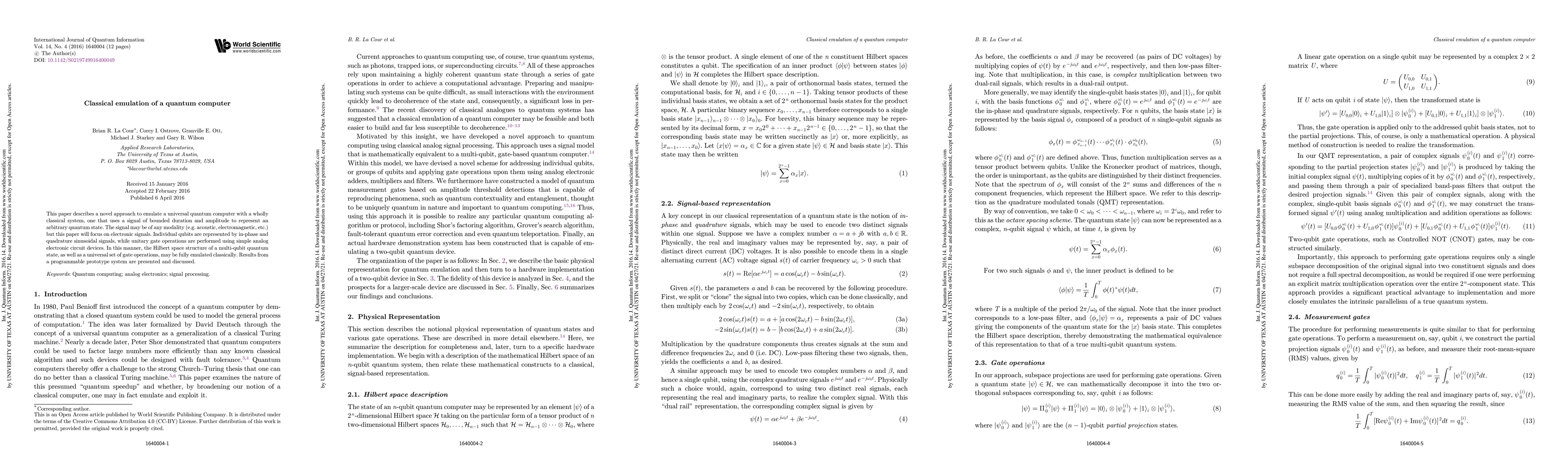 This paper describes a novel approach to emulate a universal quantum computer with a wholly classical system, one that uses a signal of bounded duration and amplitude to represent an arbitrary quantum state. The signal may be of any modality (e.g. acoustic, electromagnetic, etc.) but this paper will focus on electronic signals. Individual qubits are represented by in-phase and quadrature sinusoidal signals, while unitary gate operations are performed using simple analog electronic circuit devices. In this manner, the Hilbert space structure of a multi-qubit quantum state, as well as a universal set of gate operations, may be fully emulated classically. Results from a programmable prototype system are presented and discussed.