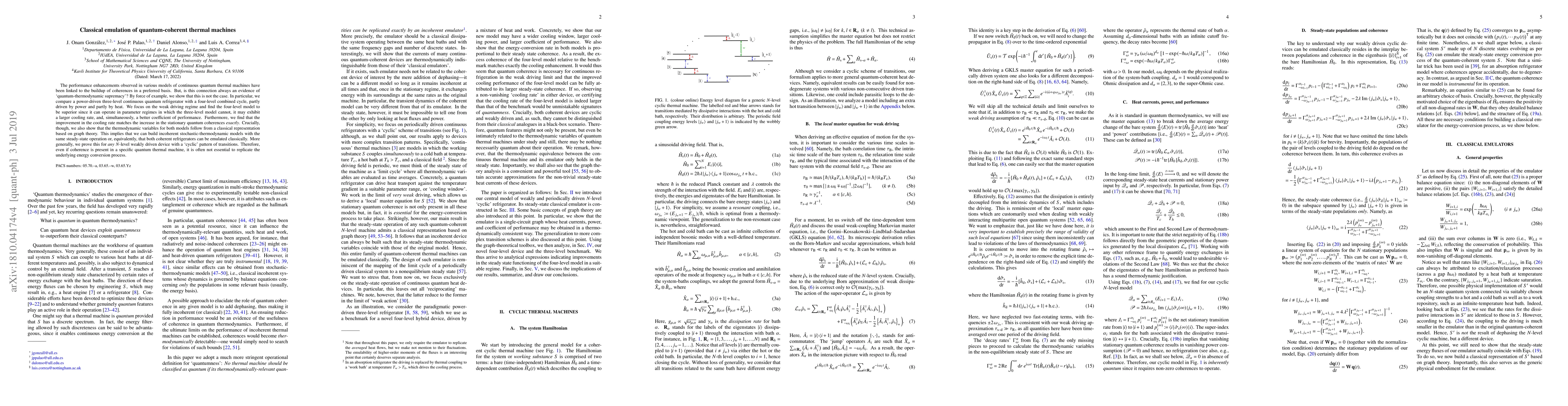 The performance enhancements observed in various models of continuous quantum thermal machines have been linked to the buildup of coherences in a preferred basis. But, is this connection always an evidence of `quantum-thermodynamic supremacy'? By force of example, we show that this is not the case. In particular, we compare a power-driven three-level continuous quantum refrigerator with a four-level combined cycle, partly driven by power and partly by heat. We focus on the weak driving regime and find the four-level model to be superior since it can operate in parameter regimes in which the three-level model cannot, it may exhibit a larger cooling rate, and, simultaneously, a better coefficient of performance. Furthermore, we find that the improvement in the cooling rate matches the increase in the stationary quantum coherences exactly. Crucially, though, we also show that the thermodynamic variables for both models follow from a classical representation based on graph theory. This implies that we can build incoherent stochastic-thermodynamic models with the same steady-state operation or, equivalently, that both coherent refrigerators can be emulated classically. More generally, we prove this for any N-level weakly driven device with a `cyclic' pattern of transitions. Therefore, even if coherence is present in a specific quantum thermal machine, it is often not essential to replicate the underlying energy conversion process.