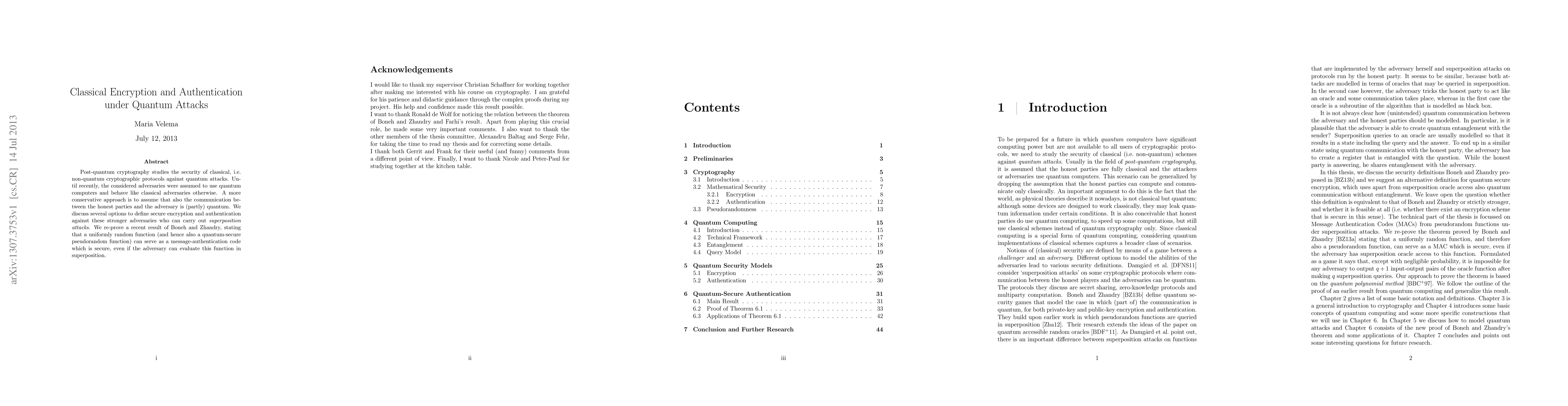 This paper explores post-quantum cryptographic protocols that secure classical encryption and authentication against quantum adversaries. It examines the security of classical protocols under the assumption that communication may also involve quantum elements, discussing methods to secure against 'superposition attacks' and reaffirms the security of a quantum-secure pseudorandom function as a message-authentication code.