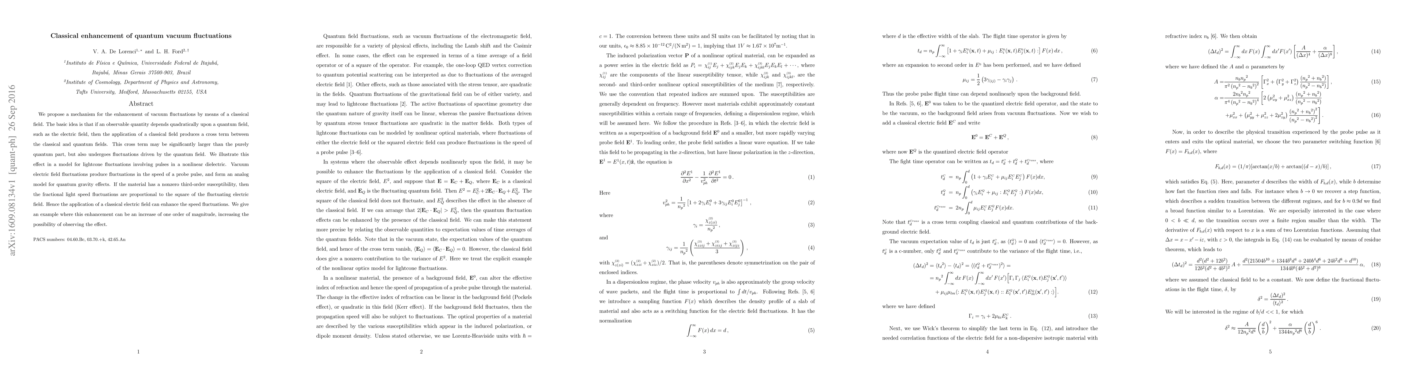 This paper proposes a mechanism for enhancing quantum vacuum fluctuations through the interaction of a classical field, showing that a cross term between classical and quantum fields can significantly amplify fluctuations. The effect is demonstrated in a model involving lightcone fluctuations in a nonlinear dielectric, where classical electric fields can boost speed fluctuations by an order of magnitude.