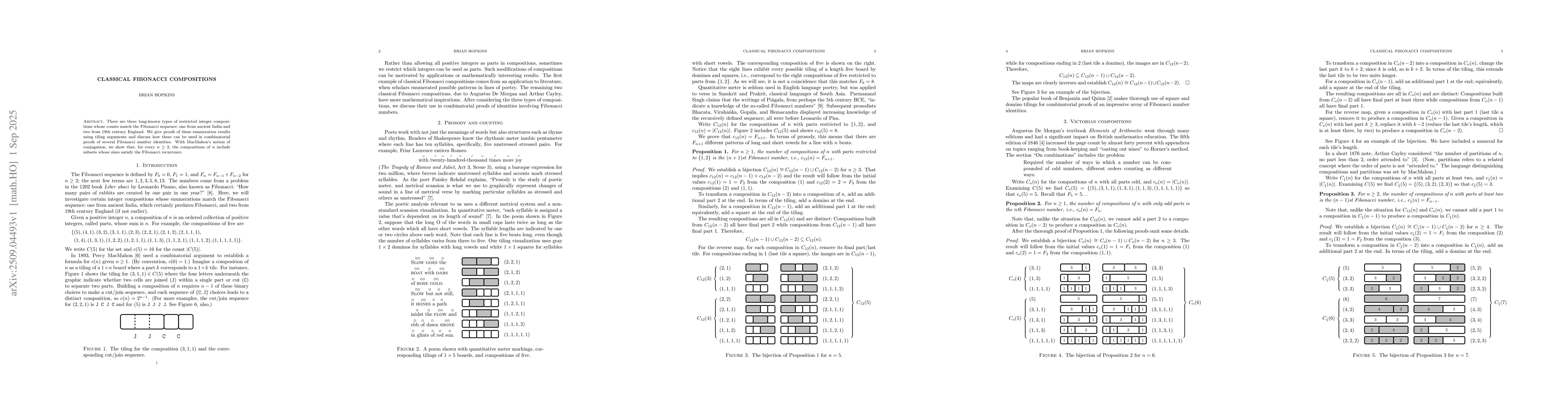 There are three long-known types of restricted integer compositions whose counts match the Fibonacci sequence:\ one from ancient India and two from 19th century England. We give proofs of these enumeration results using tiling arguments and discuss how these can be used in combinatorial proofs of several Fibonacci number identities. With MacMahon's notion of conjugation, we show that, for every $n \ge 2$, the compositions of $n$ include subsets whose sizes satisfy the Fibonacci recurrence.