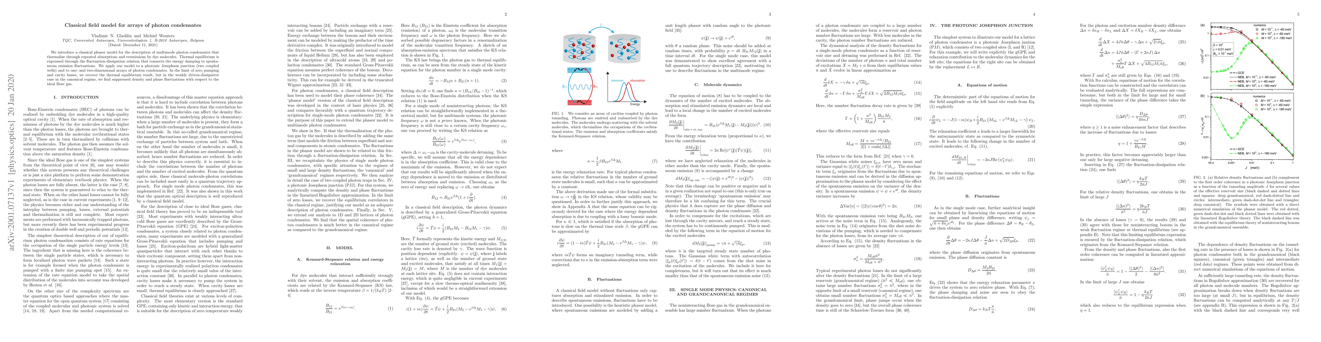 We introduce a classical phasor model for the description of multimode photon condensates that thermalize through repeated absorptions and reemissions by dye molecules. Thermal equilibrium is expressed through the fluctuation-dissipation relation that connects the energy damping to spontaneous emission fluctuations. We apply our model to a photonic Josephson junction (two coupled wells) and to one- and two-dimensional arrays of photon condensates. In the limit of zero pumping and cavity losses, we recover the thermal equilibrium result, but in the weakly driven-dissipative case in the canonical regime, we find suppressed density and phase fluctuations with respect to the ideal Bose gas.