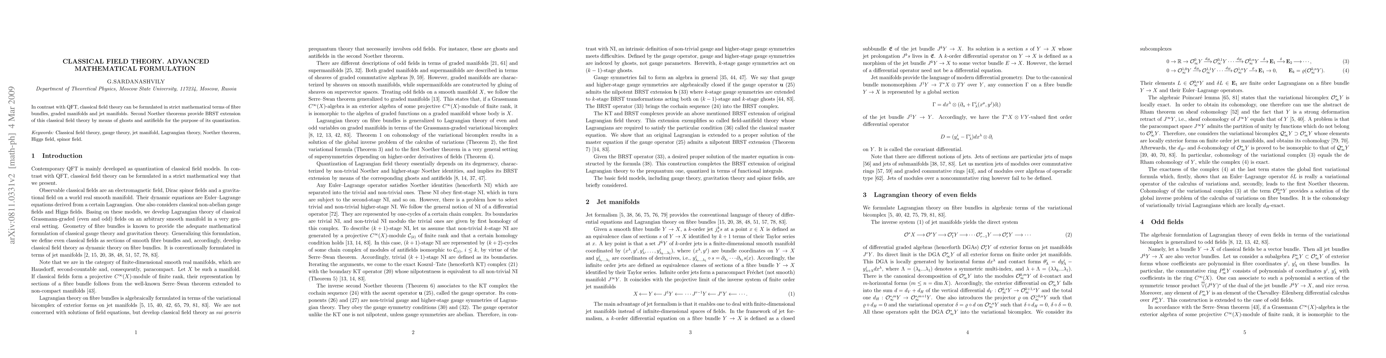 In contrast with QFT, classical field theory can be formulated in strict mathematical terms of fibre bundles, graded manifolds and jet manifolds. Second Noether theorems provide BRST extension of this classical field theory by means of ghosts and antifields for the purpose of its quantization.