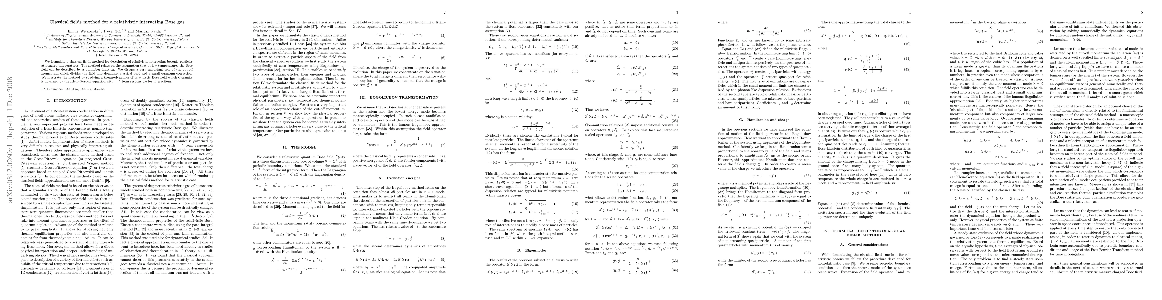 We formulate a classical fields method for description of relativistic interacting bosonic particles at nonzero temperatures. The method relays on the assumption that at low temperatures the Bose field can be described by a c-number function. We discuss a very important role of the cut-off momentum which divides the field into dominant classical part and a small quantum correction. We illustrate the method by studying a thermodynamics of relativistic Bose field which dynamics is governed by the Klein-Gordon equation with $\lambda \psi^4$ term responsible for interactions.