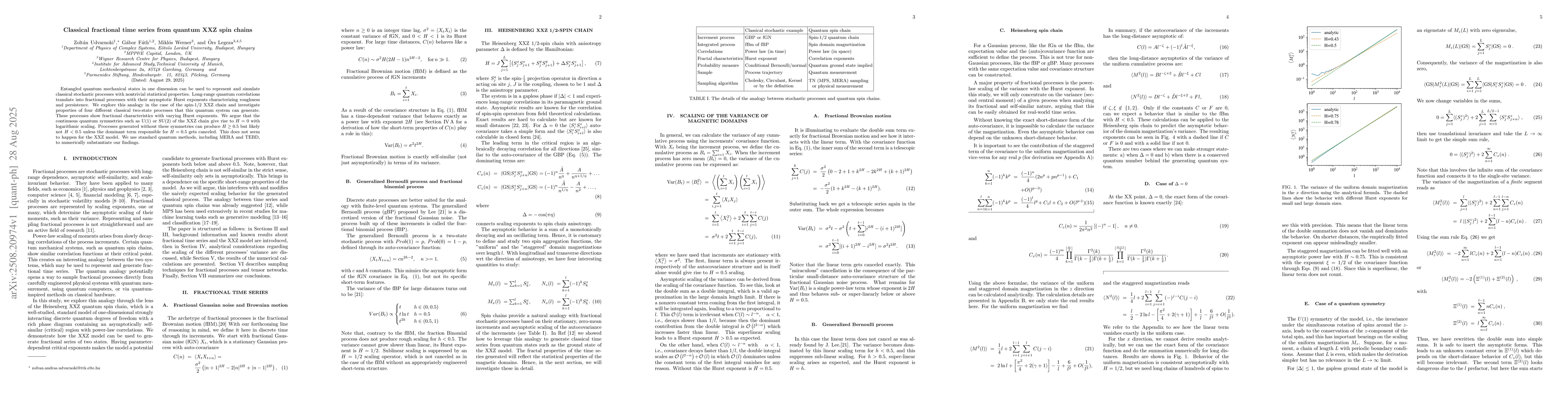 Entangled quantum mechanical states in one dimension can be used to represent and simulate classical stochastic processes with nontrivial statistical properties. Long-range quantum correlations translate into fractional processes with their asymptotic Hurst exponents characterizing roughness and persistence. We explore this analogy in the case of the spin-1/2 XXZ chain and investigate properties of four different classical two-state processes that this quantum system can generate. These processes show fractional characteristics with varying Hurst exponents. We argue that the continuous quantum symmetries such as U(1) or SU(2) of the XXZ chain give rise to $H=0$ with logarithmic scaling. Processes generated without these symmetries can produce $H \geq0.5$ but likely not $H < 0.5$ unless the dominant term responsible for $H=0.5$ gets canceled. This does not seem to happen for the XXZ model. We use standard quantum methods, including MERA and TEBD, to numerically substantiate our findings.