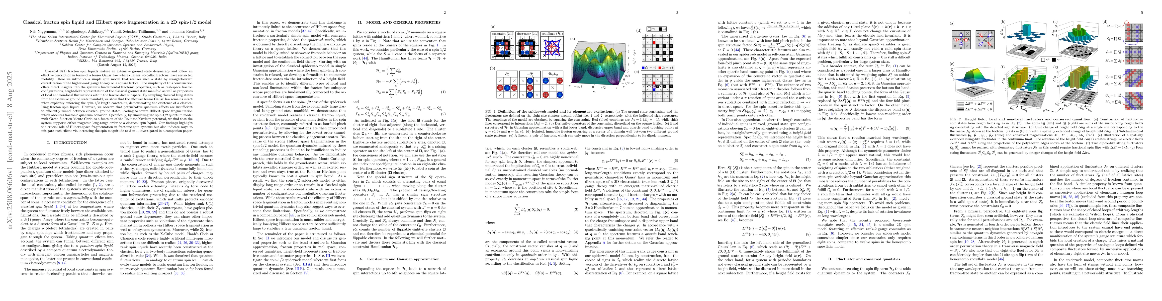 Classical U(1) fracton spin liquids feature an extensive ground state degeneracy and follow an effective description in terms of a tensor Gauss' law where charges, so-called fractons, have restricted mobility. Here we introduce a simple spin model that realizes such a state by straightforward discretization of the higher-rank gauge theory on a square lattice. The simplicity of this construction offers direct insights into the system's fundamental fractonic properties, such as real-space fracton configurations, height-field representation of the classical ground state manifold as well as properties of local and non-local fluctuations within the fracton-free subspace. By sampling classical Ising states from the extensive ground state manifold, we show that the effective tensor Gauss' law remains intact when explicitly enforcing the spin-1/2 length constraint, demonstrating the existence of a classical Ising fracton spin liquid. However, we observe that perturbative quantum effects are insufficient to efficiently tunnel between classical ground states, leading to severe Hilbert space fragmentation which obscures fractonic quantum behavior. Specifically, by simulating the spin-1/2 quantum model with Green function Monte Carlo as a function of the Rokhsar-Kivelson potential, we find that the system supports either magnetic long-range order or a classical spin liquid. Our findings highlight the crucial role of Hilbert-space fragmentation in fractonic spin systems but also indicate ways to mitigate such effects via increasing the spin magnitude to $S=1$, investigated in a companion paper.