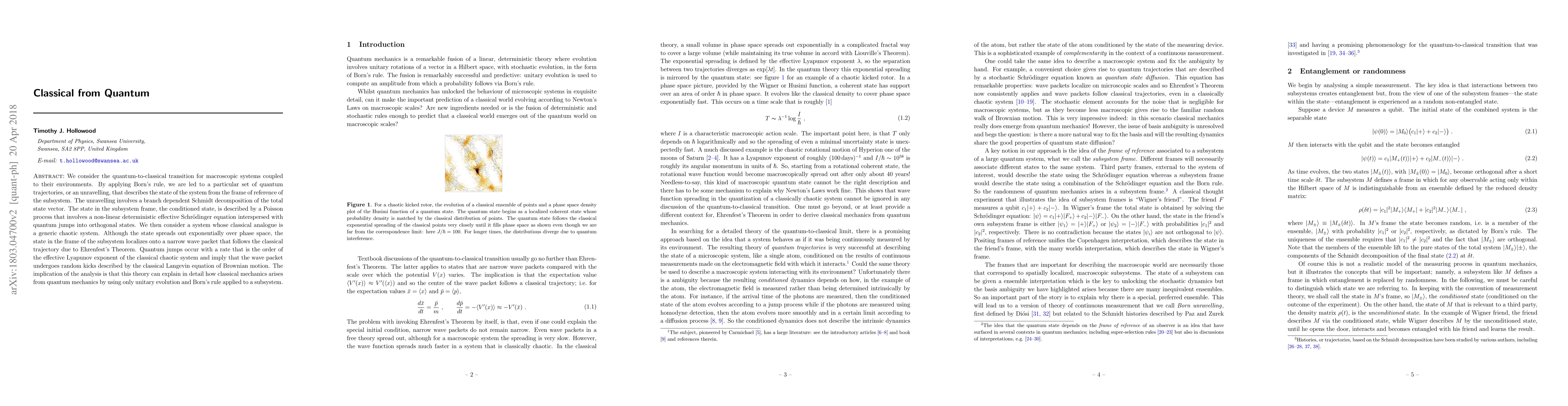 We consider the quantum-to-classical transition for macroscopic systems coupled to their environments. By applying Born's Rule, we are led to a particular set of quantum trajectories, or an unravelling, that describes the state of the system from the frame of reference of the subsystem. The unravelling involves a branch dependent Schmidt decomposition of the total state vector. The state in the subsystem frame, the conditioned state, is described by a Poisson process that involves a non-linear deterministic effective Schrodinger equation interspersed with quantum jumps into orthogonal states. We then consider a system whose classical analogue is a generic chaotic system. Although the state spreads out exponentially over phase space, the state in the frame of the subsystem localizes onto a narrow wave packet that follows the classical trajectory due to Ehrenfest's Theorem. Quantum jumps occur with a rate that is the order of the effective Lyapunov exponent of the classical chaotic system and imply that the wave packet undergoes random kicks described by the classical Langevin equation of Brownian motion. The implication of the analysis is that this theory can explain in detail how classical mechanics arises from quantum mechanics by using only unitary evolution and Born's Rule applied to a subsystem.