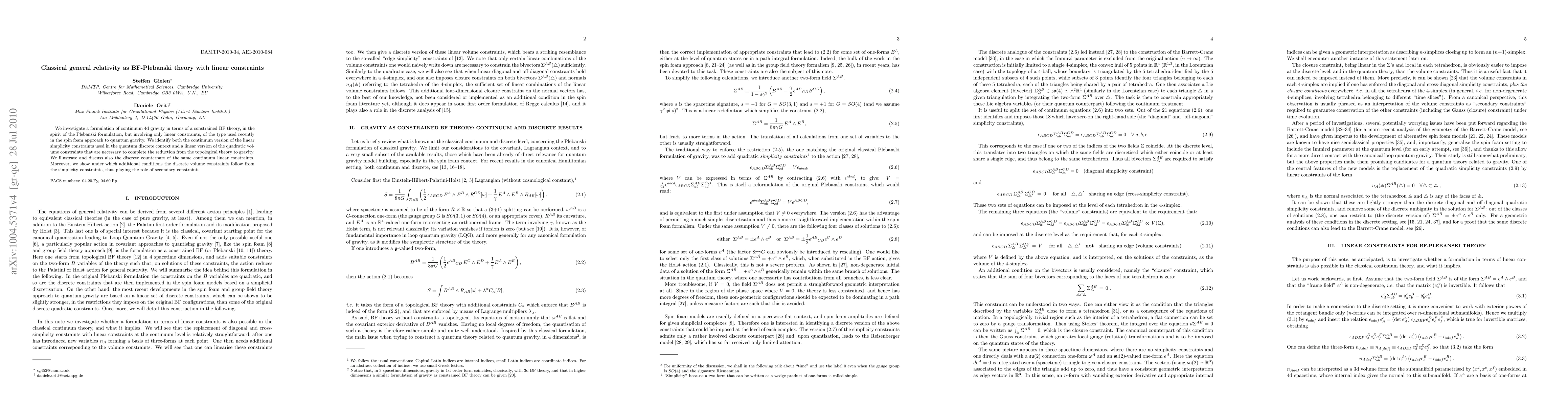 We investigate a formulation of continuum 4d gravity in terms of a constrained BF theory, in the spirit of the Plebanski formulation, but involving only linear constraints, of the type used recently in the spin foam approach to quantum gravity. We identify both the continuum version of the linear simplicity constraints used in the quantum discrete context and a linear version of the quadratic volume constraints that are necessary to complete the reduction from the topological theory to gravity. We illustrate and discuss also the discrete counterpart of the same continuum linear constraints. Moreover, we show under which additional conditions the discrete volume constraints follow from the simplicity constraints, thus playing the role of secondary constraints.