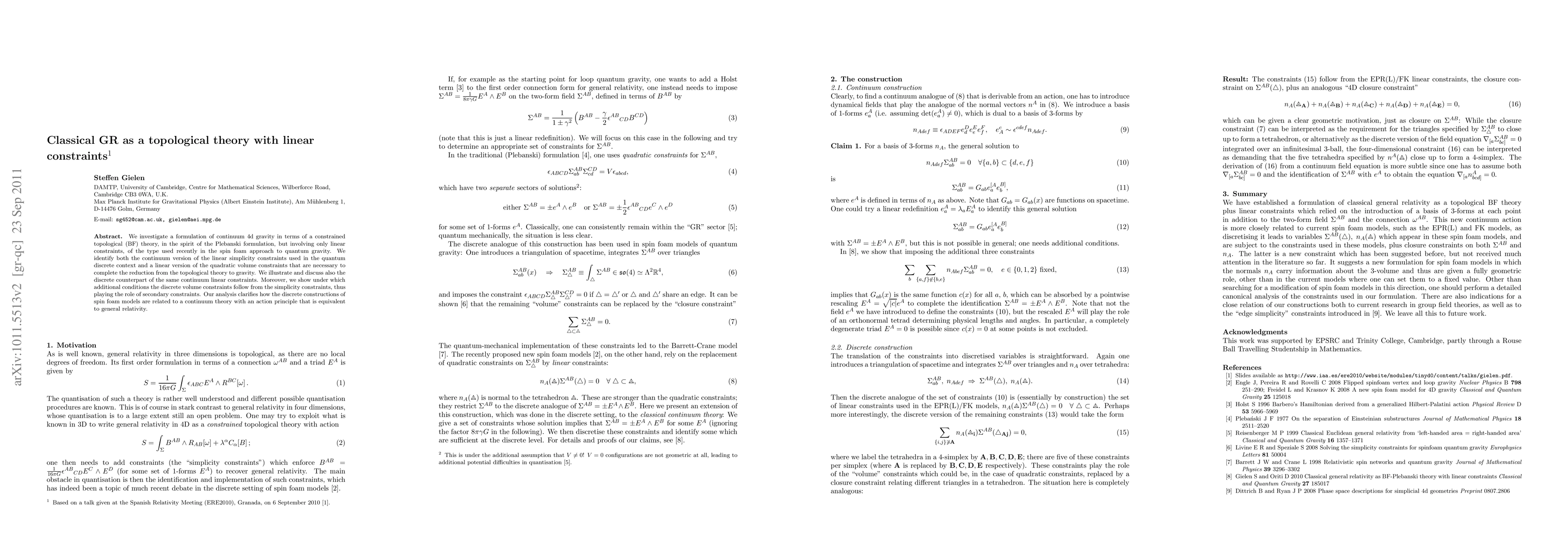 We investigate a formulation of continuum 4d gravity in terms of a constrained topological (BF) theory, in the spirit of the Plebanski formulation, but involving only linear constraints, of the type used recently in the spin foam approach to quantum gravity. We identify both the continuum version of the linear simplicity constraints used in the quantum discrete context and a linear version of the quadratic volume constraints that are necessary to complete the reduction from the topological theory to gravity. We illustrate and discuss also the discrete counterpart of the same continuum linear constraints. Moreover, we show under which additional conditions the discrete volume constraints follow from the simplicity constraints, thus playing the role of secondary constraints. Our analysis clarifies how the discrete constructions of spin foam models are related to a continuum theory with an action principle that is equivalent to general relativity.