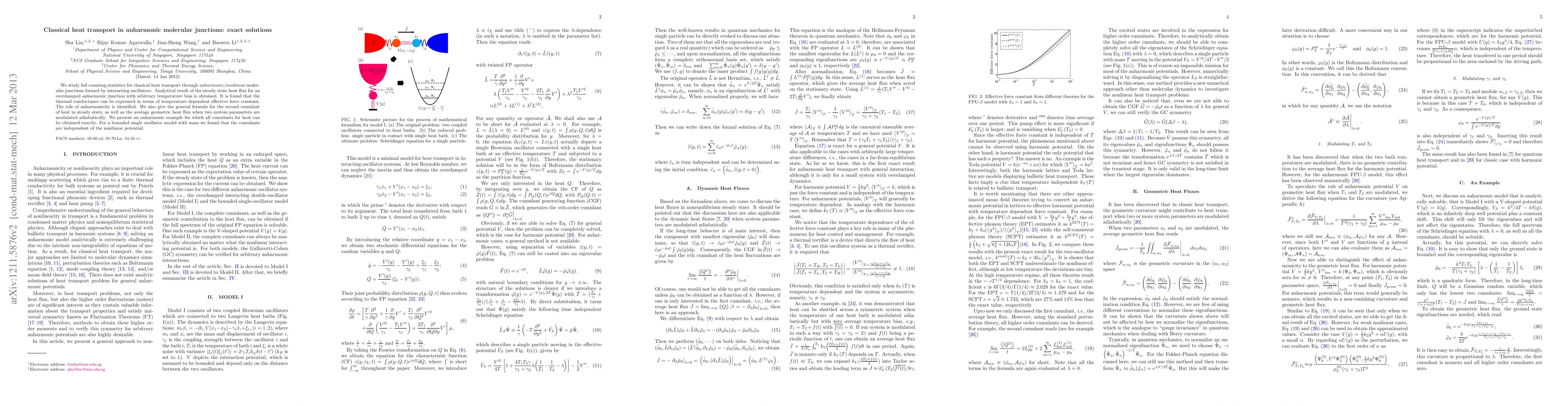 This paper presents exact solutions for classical heat transport in anharmonic molecular junctions, deriving analytical expressions for steady-state heat flux and thermal conductance, showing anharmonicity's role. It also provides formulas for the second cumulant of heat and geometric heat flux, with an example demonstrating exact cumulant derivation for a bounded oscillator model.