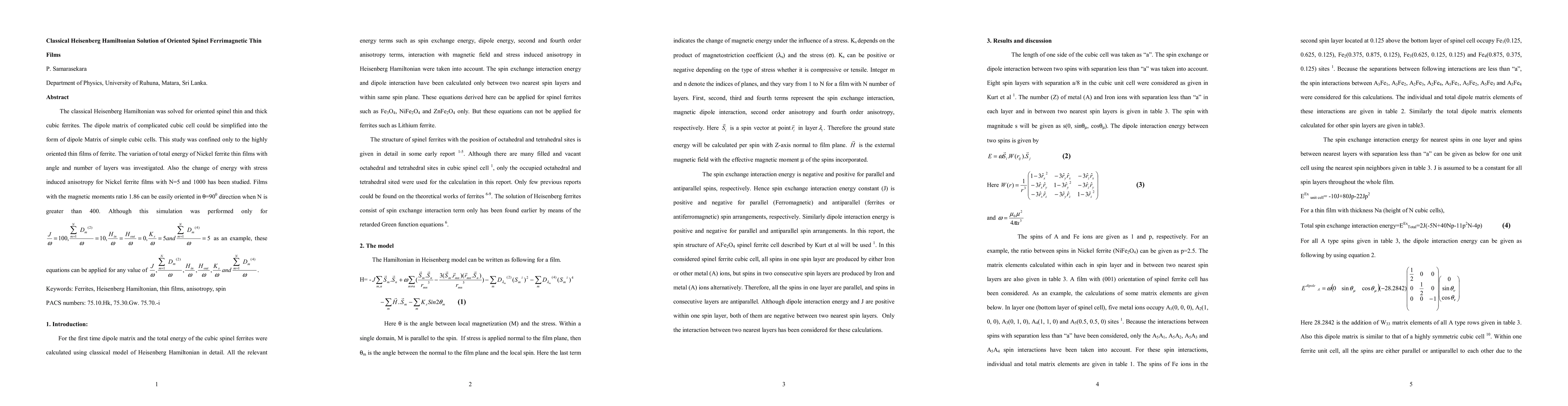 The classical Heisenberg Hamiltonian was solved for oriented spinel thin and thick cubic ferrites. The dipole matrix of complicated cubic cell could be simplified into the form of dipole Matrix of simple cubic cells. This study was confined only to the highly oriented thin films of ferrite. The variation of total energy of Nickel ferrite thin films with angle and number of layers was investigated. Also the change of energy with stress induced anisotropy for Nickel ferrite films with N=5 and 1000 has been studied. Films with the magnetic moments ratio 1.86 can be easily oriented in 90 direction when N is greater than 400.