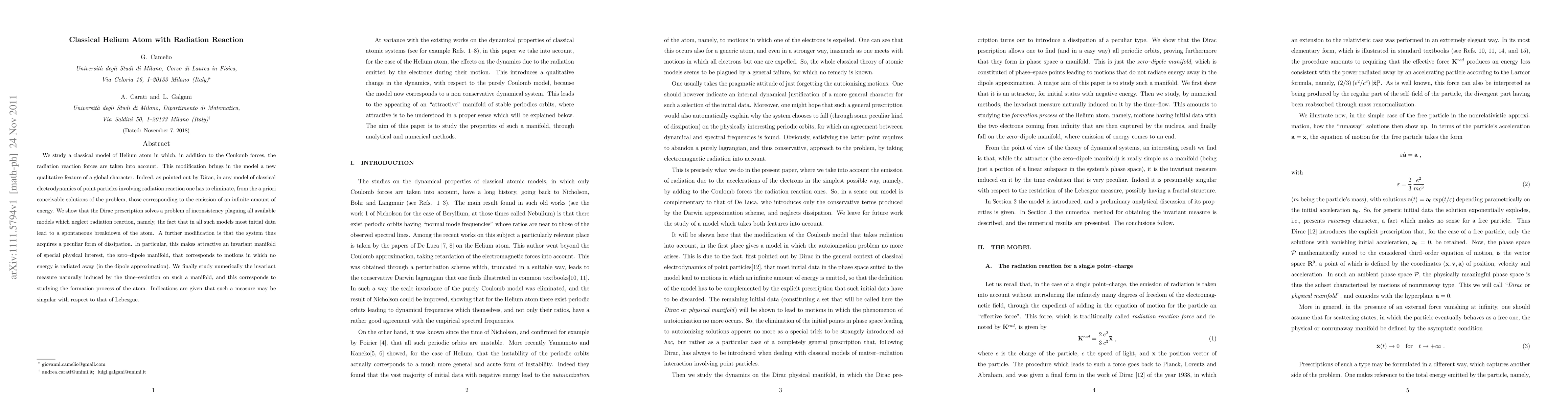 We study a classical model of Helium atom in which, in addition to the Coulomb forces, the radiation reaction forces are taken into account. This modification brings in the model a new qualitative feature of a global character. Indeed, as pointed out by Dirac, in any model of classical electrodynamics of point particles involving radiation reaction one has to eliminate, from the a priori conceivable solutions of the problem, those corresponding to the emission of an infinite amount of energy. We show that the Dirac prescription solves a problem of inconsistency plaguing all available models which neglect radiation reaction, namely, the fact that in all such models most initial data lead to a spontaneous breakdown of the atom. A further modification is that the system thus acquires a peculiar form of dissipation. In particular, this makes attractive an invariant manifold of special physical interest, the zero--dipole manifold, that corresponds to motions in which no energy is radiated away (in the dipole approximation). We finally study numerically the invariant measure naturally induced by the time--evolution on such a manifold, and this corresponds to studying the formation process of the atom. Indications are given that such a measure may be singular with respect to that of Lebesgue.
