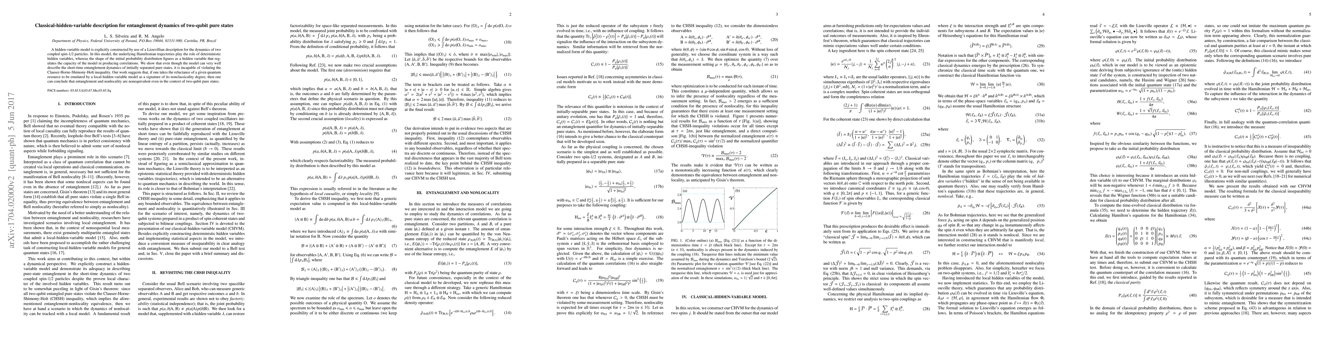 A hidden-variable model is explicitly constructed by use of a Liouvillian description for the dynamics of two coupled spin-1/2 particles. In this model, the underlying Hamiltonian trajectories play the role of deterministic hidden variables, whereas the shape of the initial probability distribution figures as a hidden variable that regulates the capacity of the model in producing correlations. We show that even though the model can very well describe the short-time entanglement dynamics of initially separated pure states, it is incapable of violating the Clauser-Horne-Shimony-Holt inequality. Our work suggests that, if one takes the reluctance of a given quantum resource to be emulated by a local-hidden-variable model as a signature of its nonclassicality degree, then one can conclude that entanglement and nonlocality are nonequivalent even in the context of two-qubit pure states.