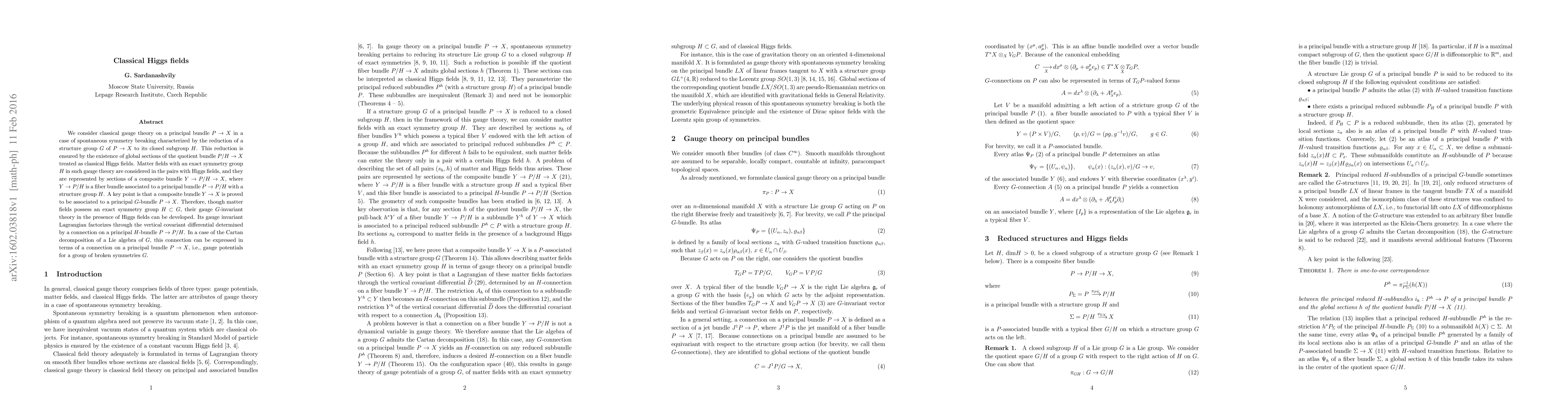 We consider classical gauge theory on a principal bundle P->X in a case of spontaneous symmetry breaking characterized by the reduction of a structure group G of P->X to its closed subgroup H. This reduction is ensured by the existence of global sections of the quotient bundle P/H->X treated as classical Higgs fields. Matter fields with an exact symmetry group H in such gauge theory are considered in the pairs with Higgs fields, and they are represented by sections of a composite bundle Y->P/H->X, where Y->P/H is a fiber bundle associated to a principal bundle P->P/H with a structure group H. A key point is that a composite bundle Y->X is proved to be associated to a principal G-bundle P->X. Therefore, though matter fields possess an exact symmetry group H, their gauge G-invariant theory in the presence of Higgs fields can be developed. Its gauge invariant Lagrangian factorizes through the vertical covariant differential determined by a connection on a principal H-bundle P->P/H. In a case of the Cartan decomposition of a Lie algebra of G, this connection can be expressed in terms of a connection on a principal bundle P->X, i.e., gauge potentials for a group of broken symmetries G.