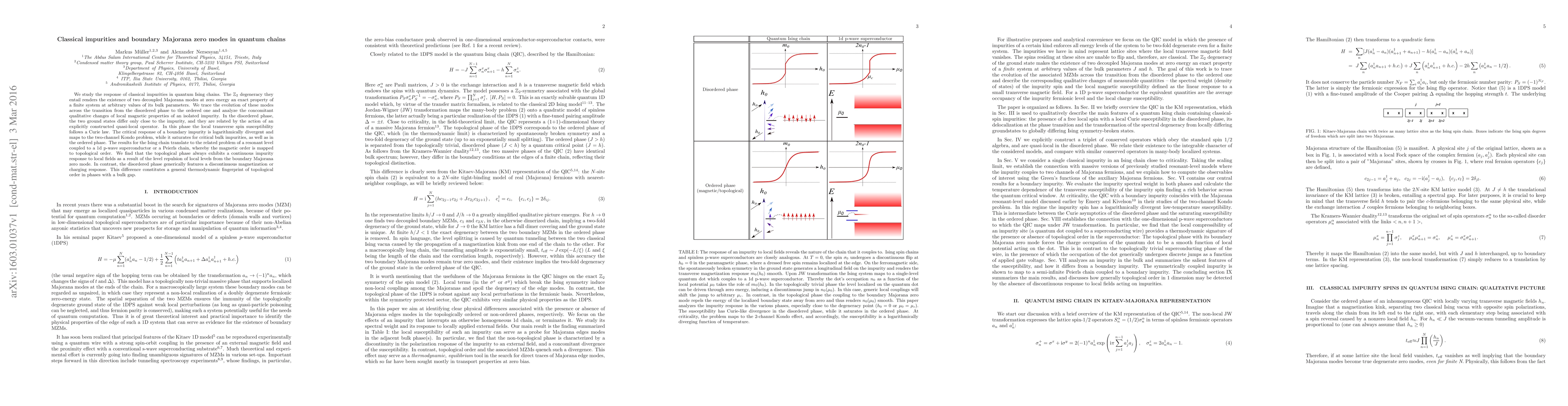 We study the response of classical impurities in quantum Ising chains. The Z2 degeneracy they entail renders the existence of two decoupled Majorana modes at zero energy an exact property of a finite system at arbitrary values of its bulk parameters. We trace the evolution of these modes across the transition from the disordered phase to the ordered one and analyze the concomitant qualitative changes of local magnetic properties of an isolated impurity. In the disordered phase, the two ground states differ only close to the impurity, and they are related by the action of an explicitly constructed quasi-local operator. In this phase the local transverse spin susceptibility follows a Curie law. The critical response of a boundary impurity is logarithmically divergent and maps to the two-channel Kondo problem, while it saturates for critical bulk impurities, as well as in the ordered phase. The results for the Ising chain translate to the related problem of a resonant level coupled to a 1d p-wave superconductor or a Peierls chain, whereby the magnetic order is mapped to topological order. We find that the topological phase always exhibits a continuous impurity response to local fields as a result of the level repulsion of local levels from the boundary Majorana zero mode. In contrast, the disordered phase generically features a discontinuous magnetization or charging response. This difference constitutes a general thermodynamic fingerprint of topological order in phases with a bulk gap.
