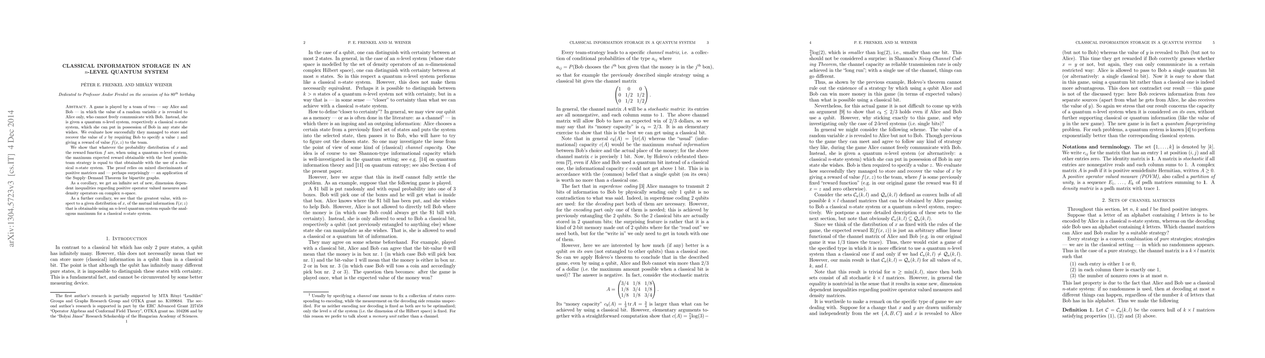 A game is played by a team of two --- say Alice and Bob --- in which the value of a random variable $x$ is revealed to Alice only, who cannot freely communicate with Bob. Instead, she is given a quantum $n$-level system, respectively a classical $n$-state system, which she can put in possession of Bob in any state she wishes. We evaluate how successfully they managed to store and recover the value of $x$ in the used system by requiring Bob to specify a value $z$ and giving a reward of value $ f(x,z)$ to the team. We show that whatever the probability distribution of $x$ and the reward function $f$ are, when using a quantum $n$-level system, the maximum expected reward obtainable with the best possible team strategy is equal to that obtainable with the use of a classical $n$-state system. The proof relies on mixed discriminants of positive matrices and --- perhaps surprisingly --- an application of the Supply--Demand Theorem for bipartite graphs. As a corollary, we get an infinite set of new, dimension dependent inequalities regarding positive operator valued measures and density operators on complex $n$-space. As a further corollary, we see that the greatest value, with respect to a given distribution of $x$, of the mutual information $I(x;z)$ that is obtainable using an $n$-level quantum system equals the analogous maximum for a classical $n$-state system.