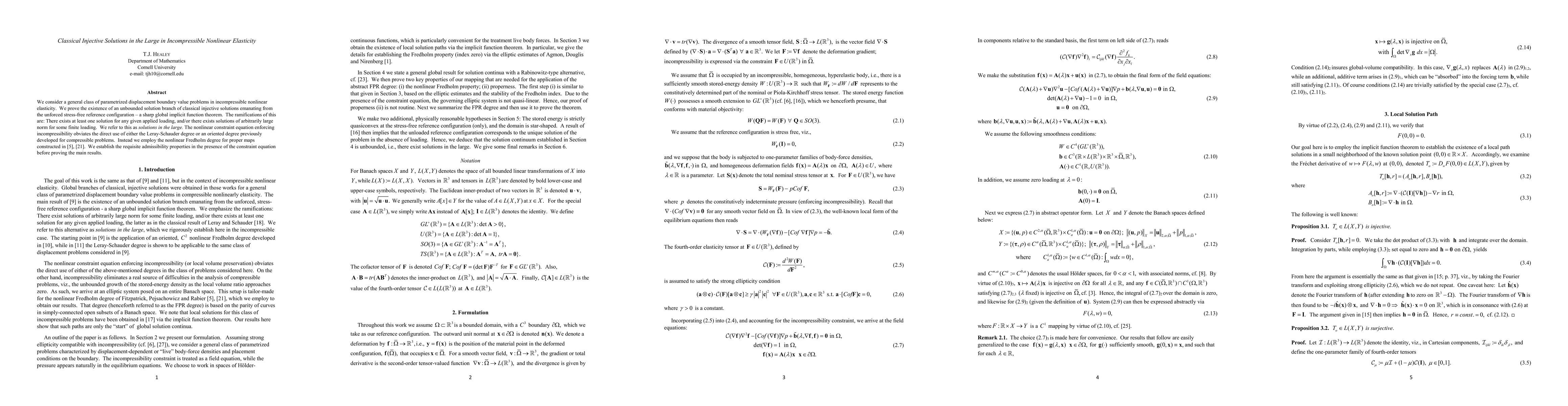 We consider a general class of parametrized displacement boundary value problems in incompressible nonlinear elasticity. We prove the existence of an unbounded solution branch of classical injective solutions emanating from the unforced stress-free reference configuration, which constitutes a sharp global implicit function theorem. The ramifications of this are: There exists at least one solution for any given applied loading, and or there exists solutions of arbitrarily large norm for some finite loading. We refer to this as solutions in the large. The nonlinear constraint equation enforcing incompressibility obviates the direct use of either the Leray-Schauder degree or an oriented degree previously developed for compressible problems. Instead we employ the nonlinear Fredholm degree for proper maps developed by Fitzpatrick, et. al. We establish the requisite admissibility properties in the presence of the constraint equation before proving the main results.