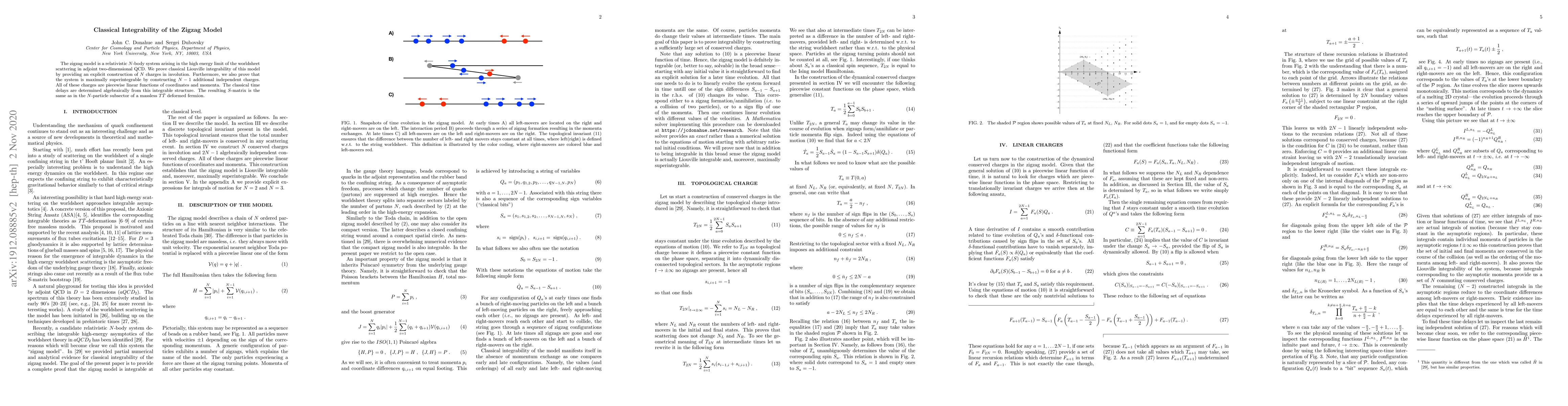 The zigzag model, a relativistic $N$-body system from high energy adjoint two-dimensional QCD, is proven to be classically Liouville integrable with $N$ involution charges. It is also shown to be maximally superintegrable with $N-1$ additional independent charges, leading to an algebraic determination of classical time delays and an $S$-matrix matching that of a massless $T\bar{T}$ deformed fermion.