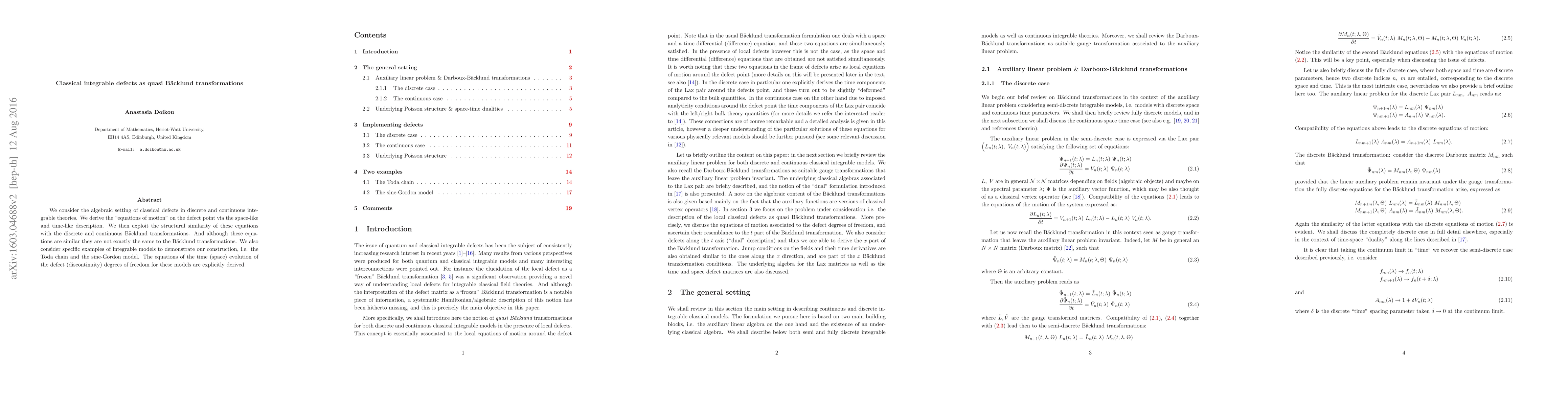 We consider the algebraic setting of classical defects in discrete and continuous integrable theories. We derive the "equations of motion" on the defect point via the space-like and time-like description. We then exploit the structural similarity of these equations with the discrete and continuous Backlund transformations. And although these equations are similar they are not exactly the same to the Backlund transformations. We also consider specific examples of integrable models to demonstrate our construction, i.e. the Toda chain and the sine-Gordon model. The equations of the time (space) evolution of the defect (discontinuity) degrees of freedom for these models are explicitly derived.