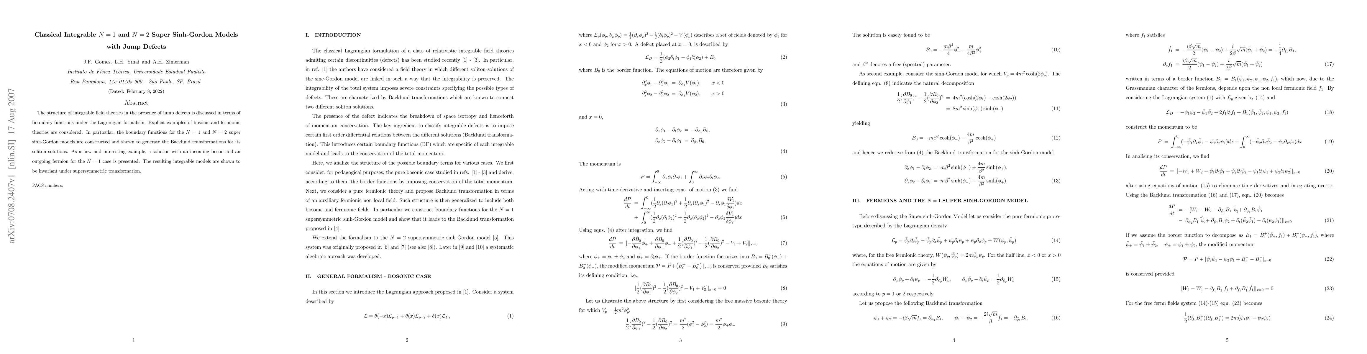 The structure of integrable field theories in the presence of jump defects is discussed in terms of boundary functions under the Lagrangian formalism. Explicit examples of bosonic and fermionic theories are considered. In particular, the boundary functions for the N=1 and N=2 super sinh-Gordon models are constructed and shown to generate the Backlund transformations for its soliton solutions. As a new and interesting example, a solution with an incoming boson and an outgoing fermion for the N=1 case is presented. The resulting integrable models are shown to be invariant under supersymmetric transformation.