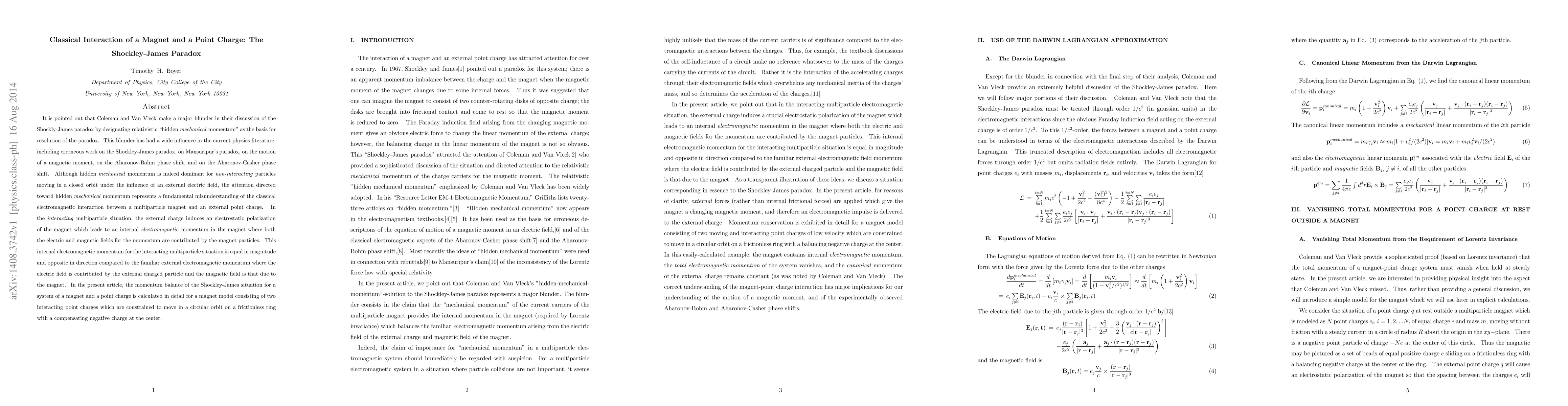 It is pointed out that Coleman and Van Vleck make a major blunder in their discussion of the Shockly-James paradox by designating relativistic hidden mechanical momentum as the basis for resolution of the paradox. This blunder has had a wide influence in the current physics literature, including erroneous work on the Shockley-James paradox, on Mansuripur's paradox, on the motion of a magnetic moment, on the Aharonov-Bohm phase shift, and on the Aharonov-Casher phase shift. Although hidden mechanical momentum is indeed dominant for non-interacting particles moving in a closed orbit under the influence of an external electric field, the attention directed toward hidden mechanical momentum represents a fundamental misunderstanding of the classical electromagnetic interaction between a multiparticle magnet and an external point charge. In the interacting multiparticle situation, the external charge induces an electrostatic polarization of the magnet which leads to an internal electromagnetic momentum in the magnet where both the electric and magnetic fields for the momentum are contributed by the magnet particles. This internal electromagnetic momentum for the interacting multiparticle situation is equal in magnitude and opposite in direction compared to the familiar external electromagnetic momentum where the electric field is contributed by the external charged particle and the magnetic field is that due to the magnet. In the present article, the momentum balance of the Shockley-James situation for a system of a magnet and a point charge is calculated in detail for a magnet model consisting of two interacting point charges which are constrained to move in a circular orbit on a frictionless ring with a compensating negative charge at the center.