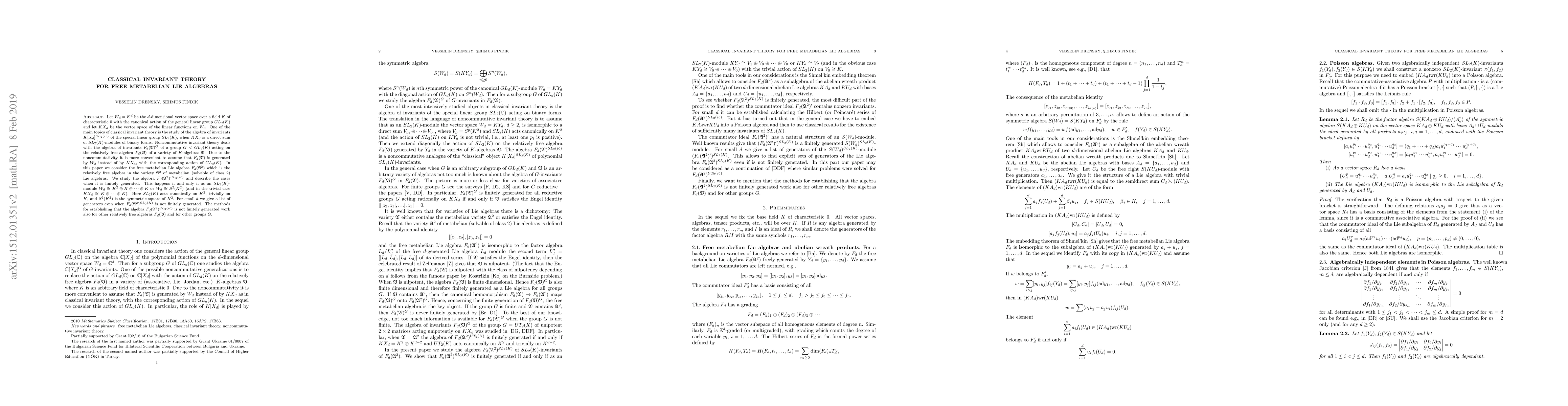 invariants $F_d({\mathfrak V})^G$ of the group $G