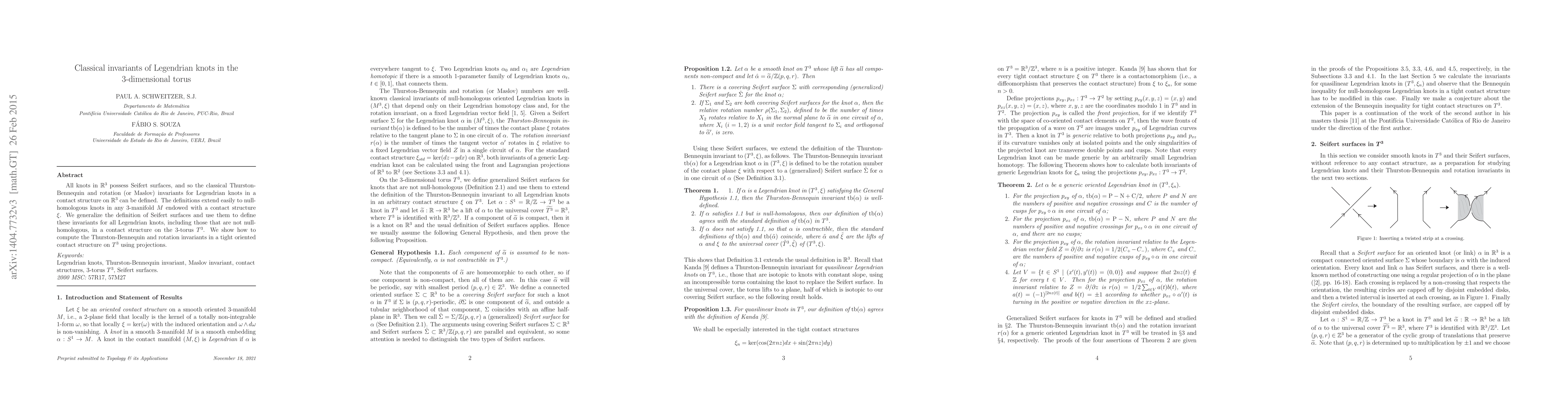 All knots in $R^3$ possess Seifert surfaces, and so the classical Thurston-Bennequin and rotation (or Maslov) invariants for Legendrian knots in a contact structure on $R^3$ can be defined. The definitions extend easily to null-homologous knots in any $3$-manifold $M$ endowed with a contact structure $\xi$. We generalize the definition of Seifert surfaces and use them to define these invariants for all Legendrian knots, including those that are not null-homologous, in a contact structure on the $3$-torus $T^3$. We show how to compute the Thurston-Bennequin and rotation invariants in a tight oriented contact structure on $T^3$ using projections.