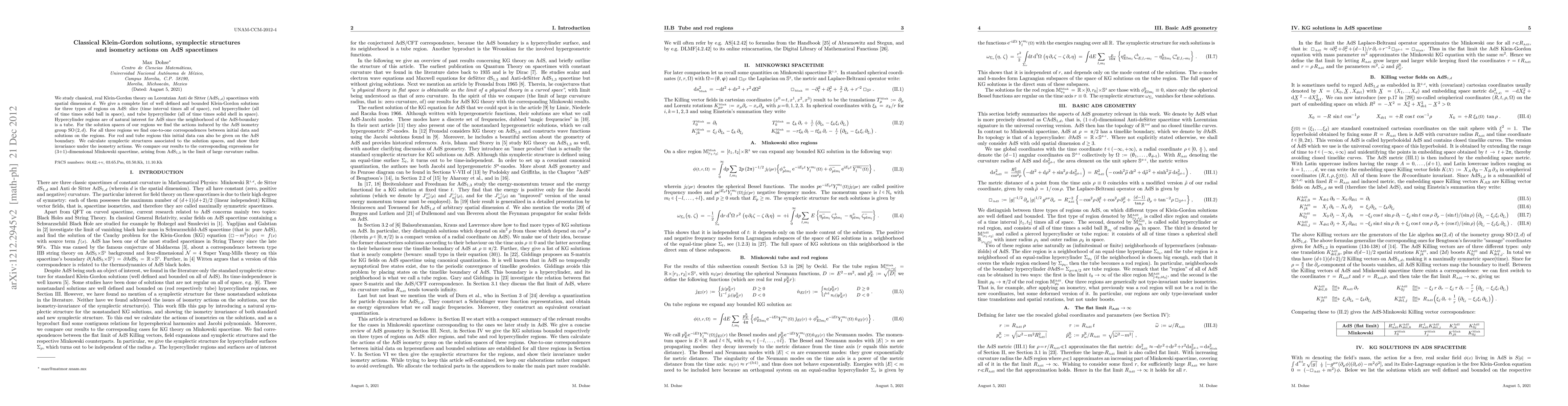 We study classical, real Klein-Gordon theory on Lorentzian Anti de Sitter (AdS_{1,d}) spacetimes with spatial dimension d. We give a complete list of well defined and bounded Klein-Gordon solutions for three types of regions on AdS: slice (time interval times all of space), rod hypercylinder (all of time times solid ball in space), and tube hypercylinder (all of time times solid shell in space). Hypercylinder regions are of natural interest for AdS since the neighborhood of the AdS-boundary is a tube. For the solution spaces of our regions we find the actions induced by the AdS isometry group SO(2,d). For all three regions we find one-to-one correspondences between initial data and solutions on the regions. For rod and tube regions this initial data can also be given on the AdS boundary. We calculate symplectic structures associated to the solution spaces, and show their invariance under the isometry actions. We compare our results to the corresponding expressions for (3+1)-dimensional Minkowski spacetime, arising from AdS_{1,3} in the limit of large curvature radius.