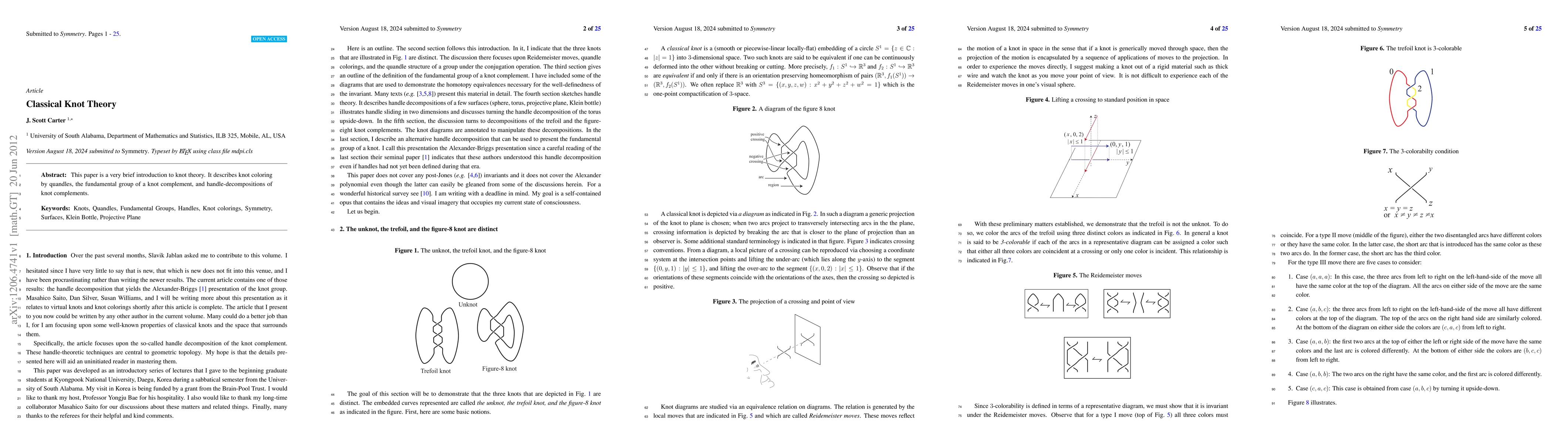 This paper is a very brief introduction to knot theory. It describes knot coloring by quandles, the fundamental group of a knot complement, and handle-decompositions of knot complements.
